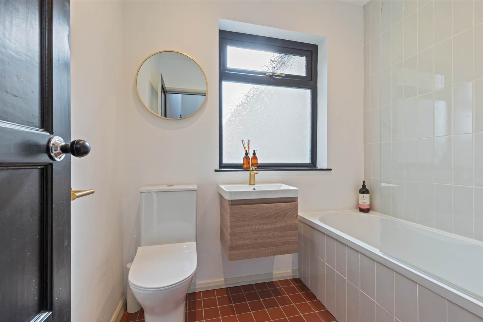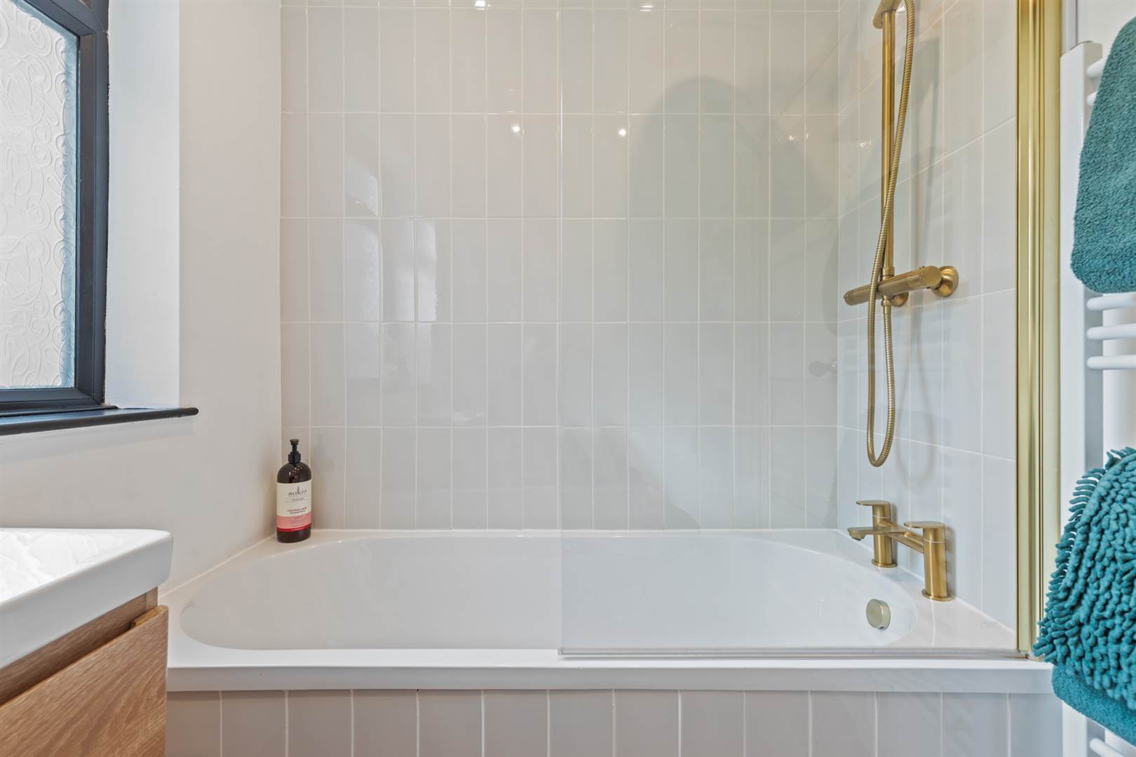Whie suite comprising panelled bath, anodised style gold mixer tap and matching drencher and telephone hand shower, vanity unit wash hand basin, anodised style gold mixer tap, low flush wc, quarry tiled floor, tiled bath/shower area, heated towel radiator, recessed lighting, extractor fan.