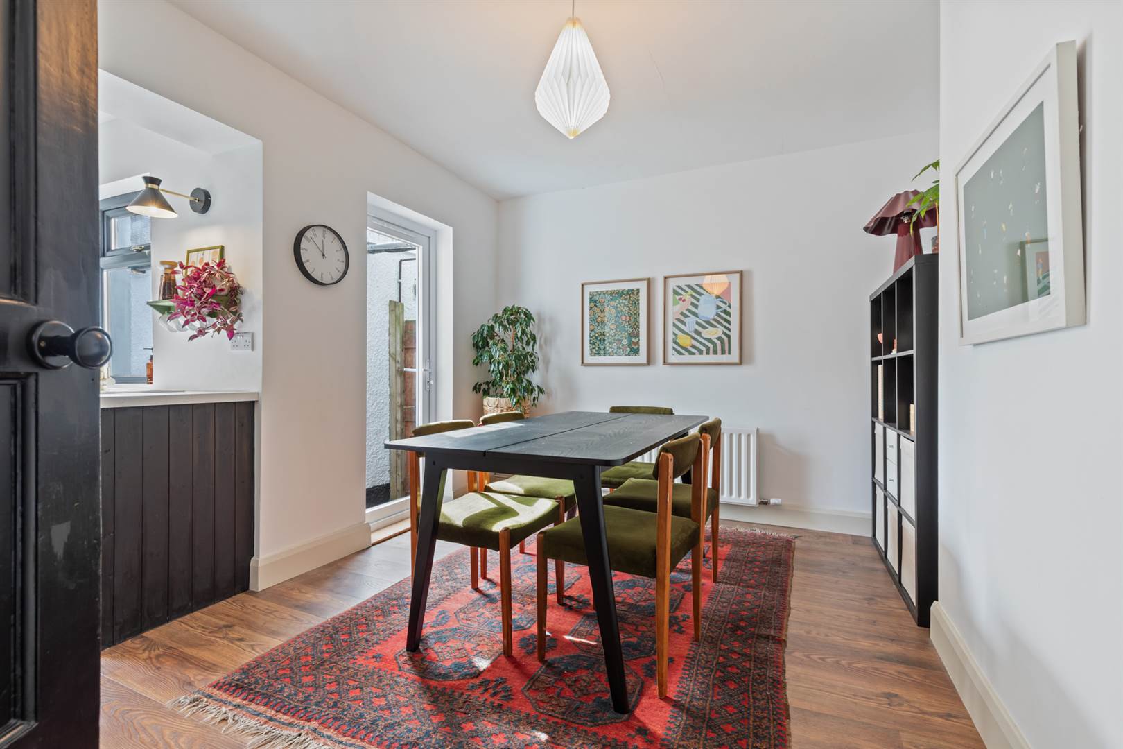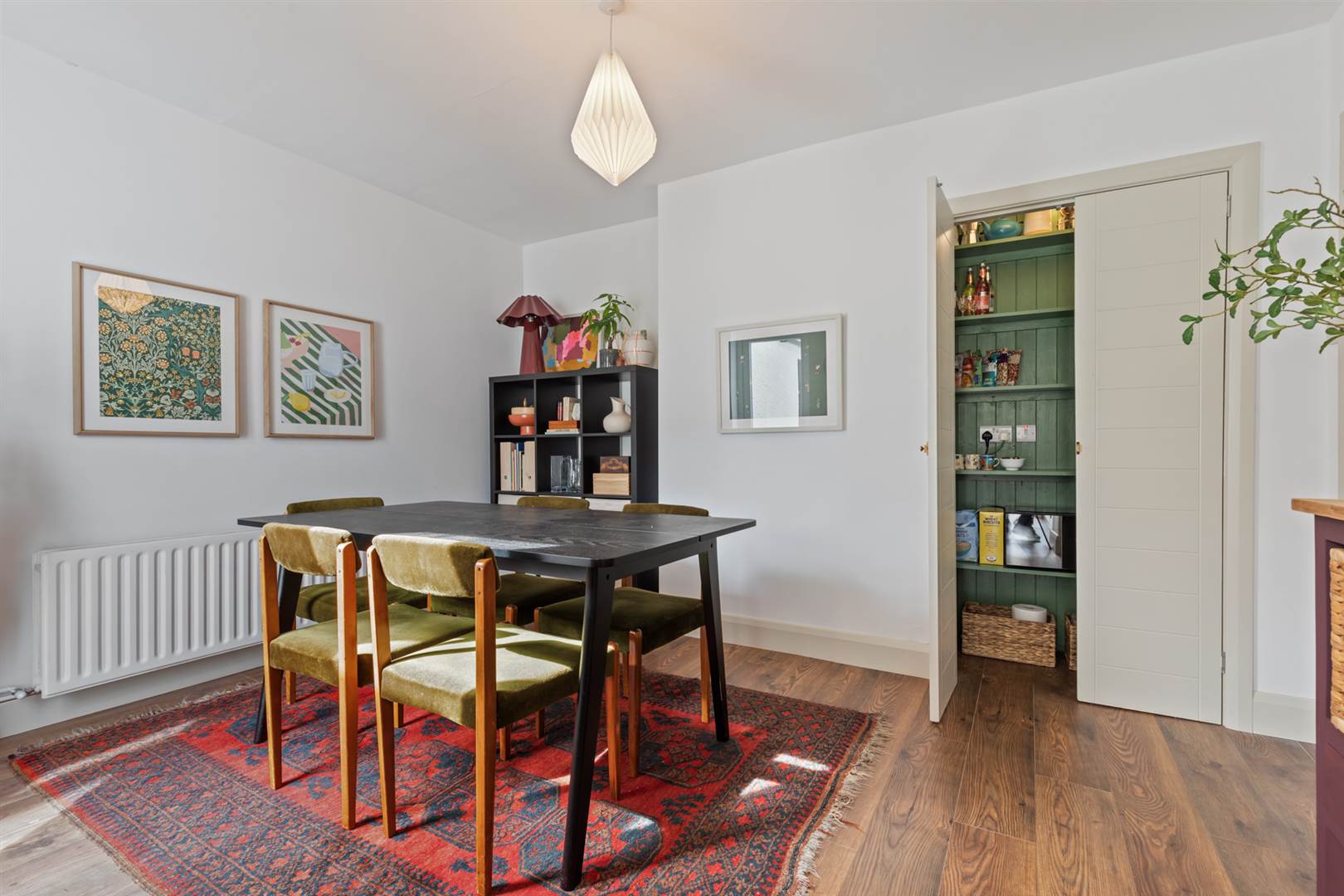 Stained oak effect laminate flooring. Large larder cupboard. uPVC double glazed door to rear garden. Open to: