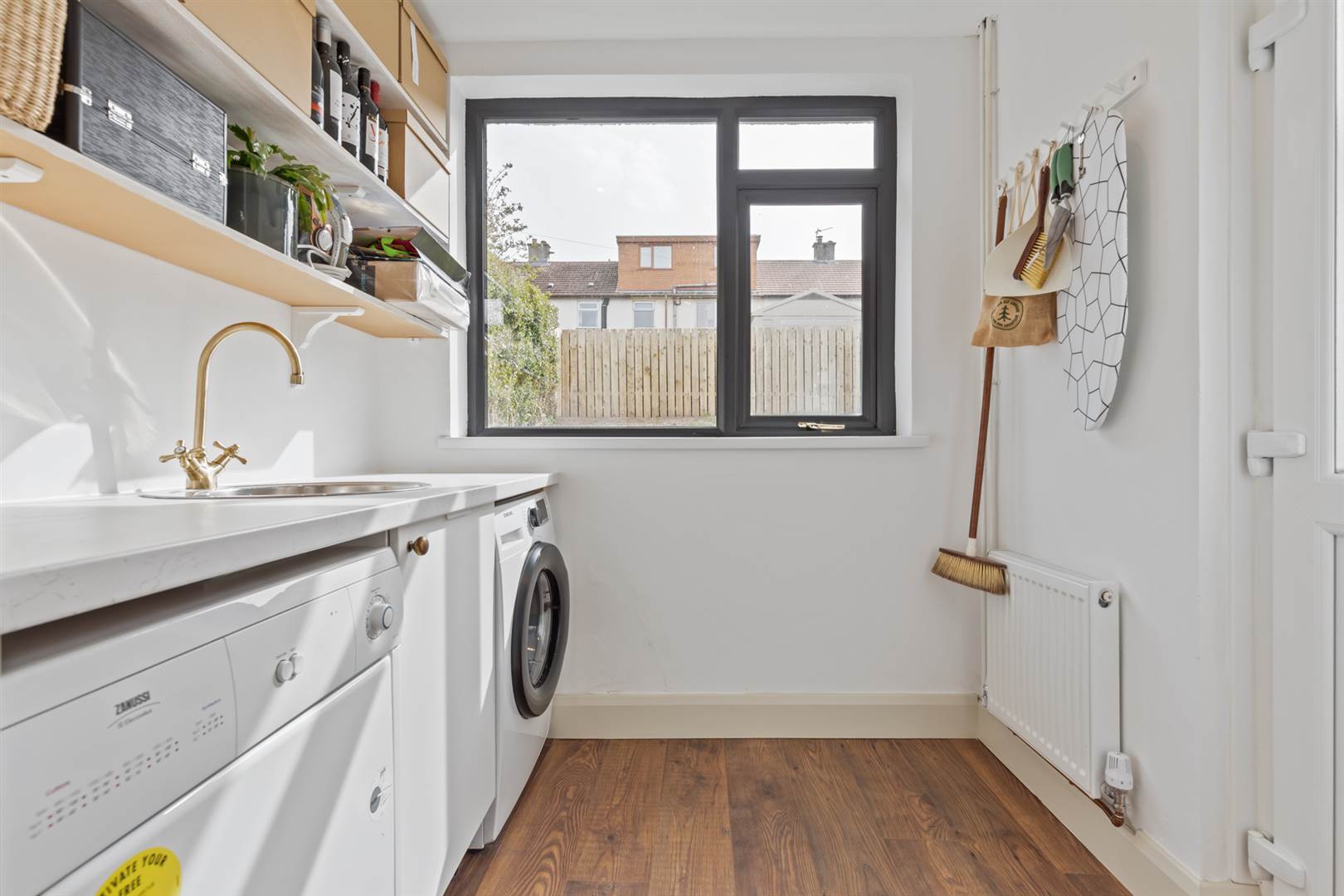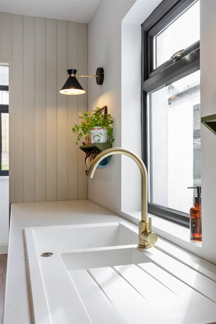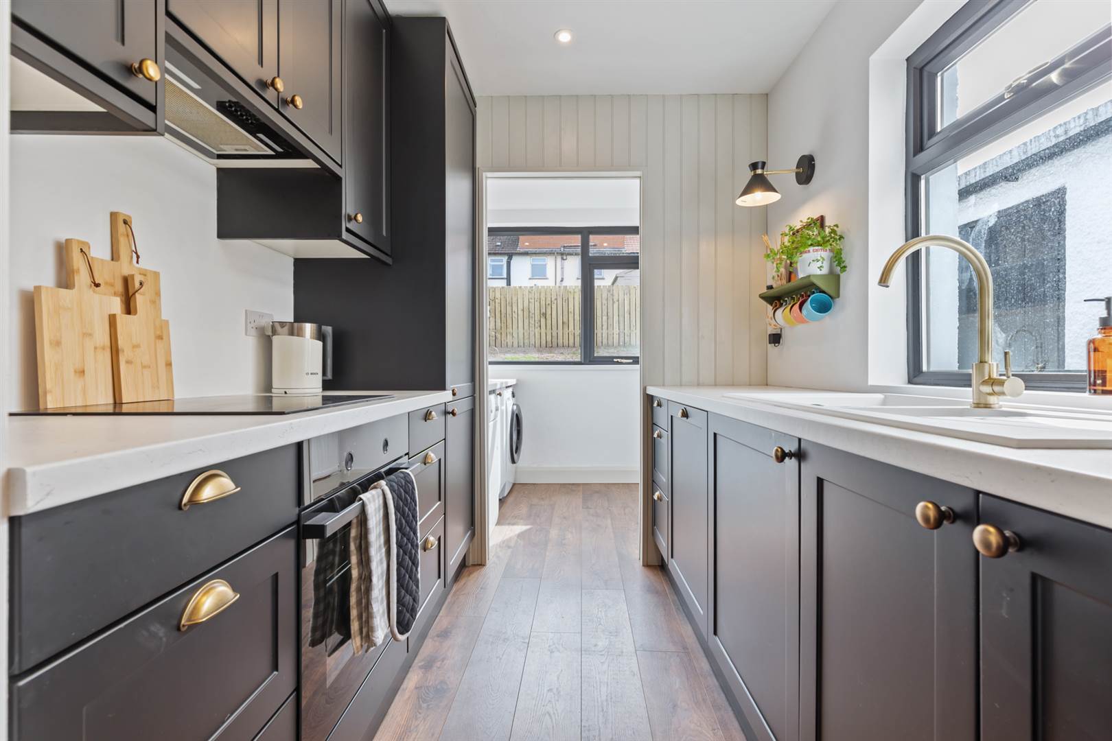Range of shelving storage, Quartz effect laminate worktops, circular stainless steel sink, anodised style gold mixer tap, plumbed for washing machine, space for tumble dyer, recessed lighting, stained oak effect laminate flooring. View into rear garden. uPVC double glazed door to rear garden.
