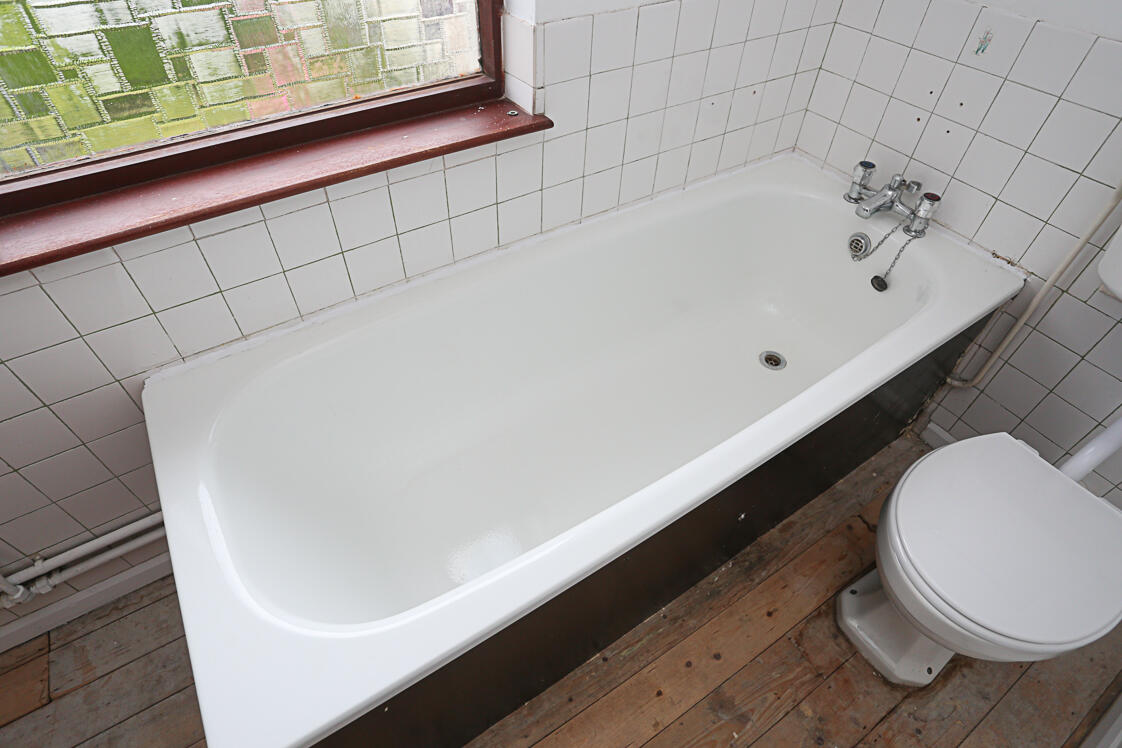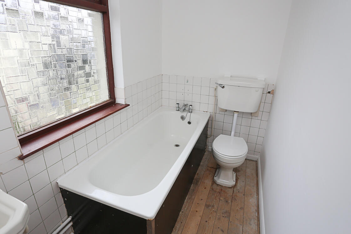 White suite comprising of low flush WC, panelled bath with mixer taps, wall hung wash hand basin with hot and cold taps, partially tiled.