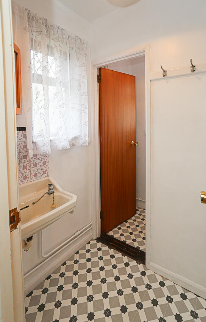 Range of high and low level units, space for cooker, space for washing machine, stainless steel sink and drainer, mixer taps, outlook to rear, partially tiled walls, access door to side.