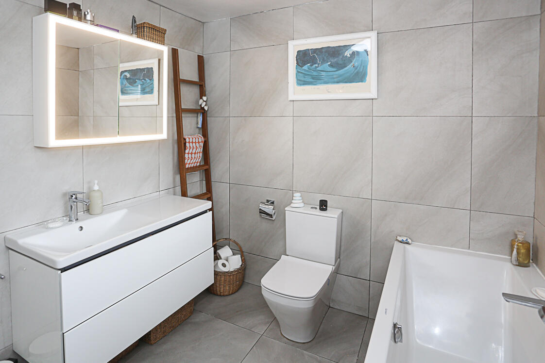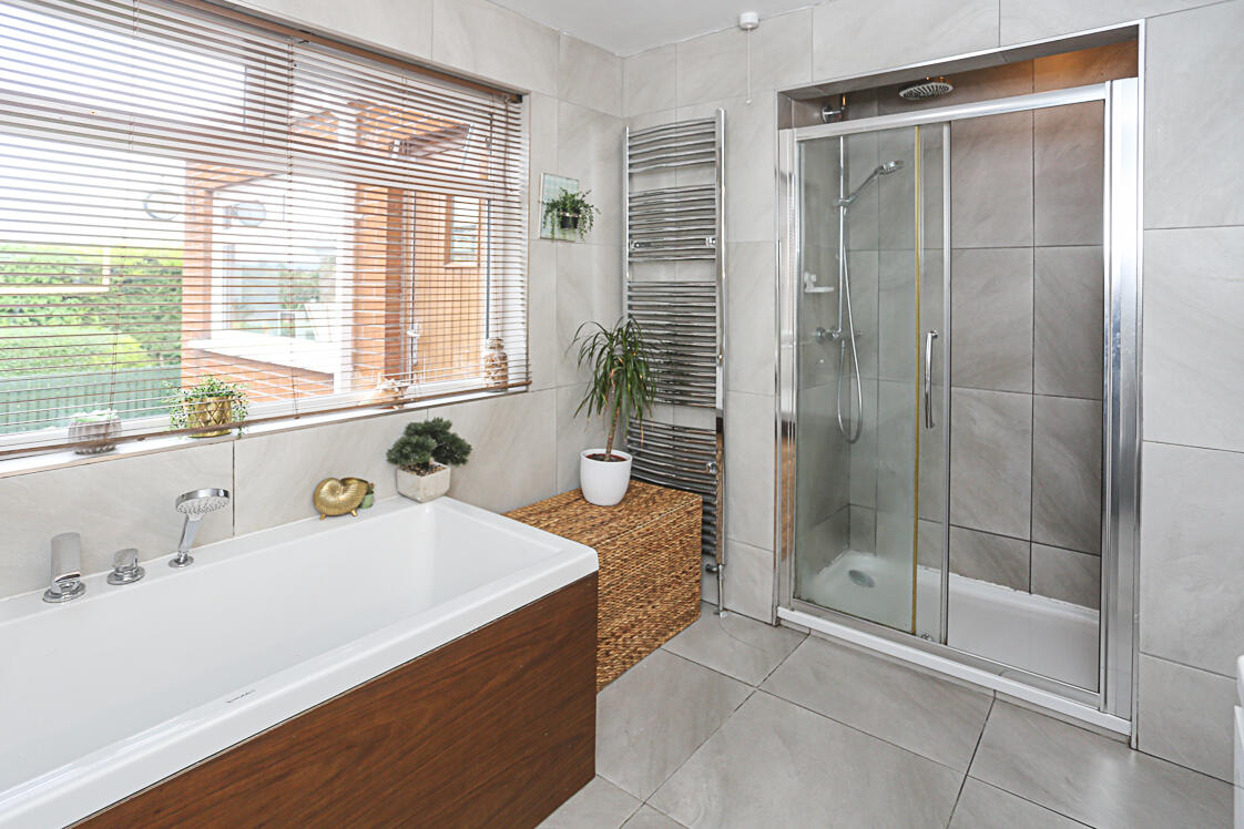 White suite comprising of low flush WC, wall hung wash hand basin, vanity storage below, chrome mixer tap, panelled Duravit bath with mixer tap, telephone handle attachment, walk-in thermostatically controlled shower, telephone handle attachment, drencher above, fully tiled walls, chrome heated towel rail, outlook to rear.