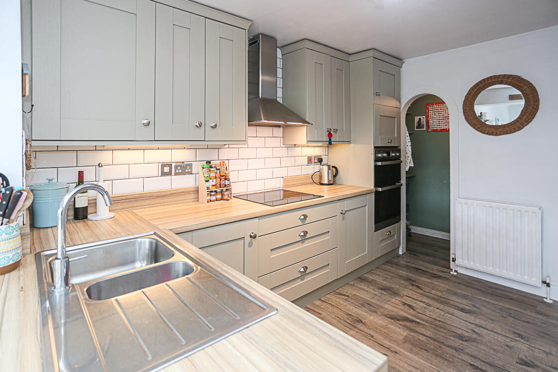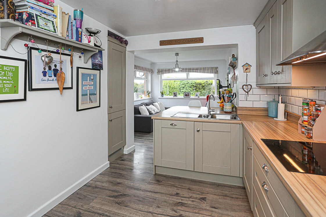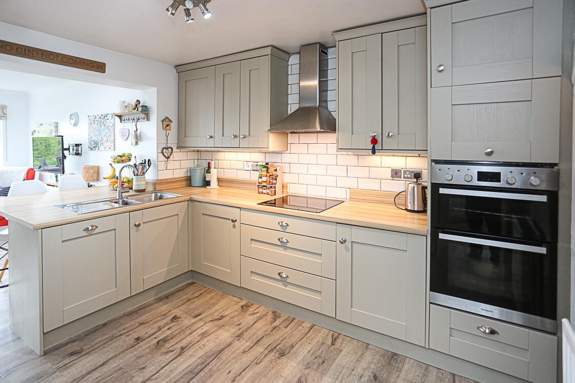 Range of high and low level units, integrated dual oven, integrated dishwasher, laminate wood effect work surface, four ring hob, subway style white tiling, stainless steel extractor fan, access through to pantry area, storage under stairs, stainless steel sink and a half with drainer, chrome mixer taps, integrated fridge, integrated freezer, casual breakfast bar dining area, laminate wood effect floor, open to lounge space with access door to rear garden and detached garage.