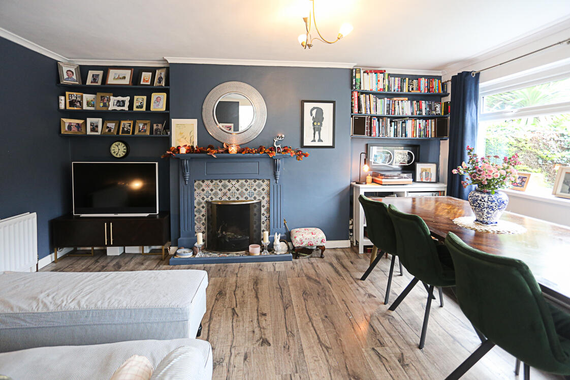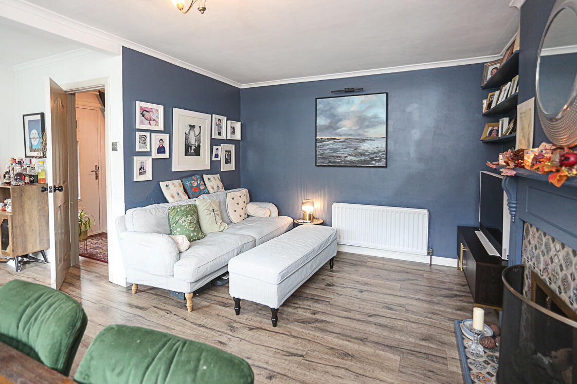 With dual aspect windows, outlook to front, laminate wood effect floor, central open fire with detail tiled surround and hearth, timber frame and mantel.