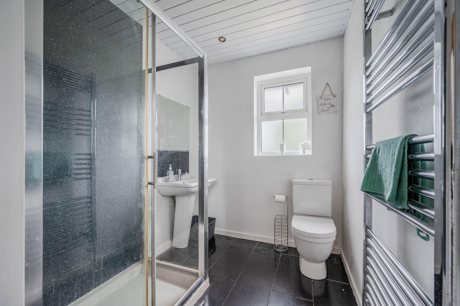 White suite comprising of low flush WC, pedestal wash hand basin with chrome mixer taps, thermostatically controlled shower with telephone handle attachment and drencher above, chrome heated towel rail, uPVC tongue and groove ceiling, extractor fan.
