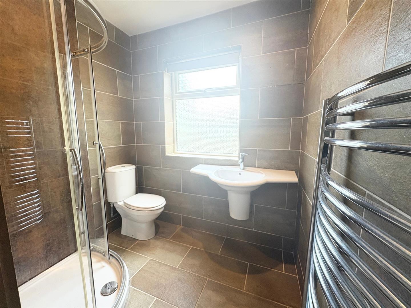 The modern ground floor shower room comprises a white suite with low flush WC, wash hand basin with chrome mixer taps, and a uPVC-panelled shower cubicle with thermostatically controlled shower unit.