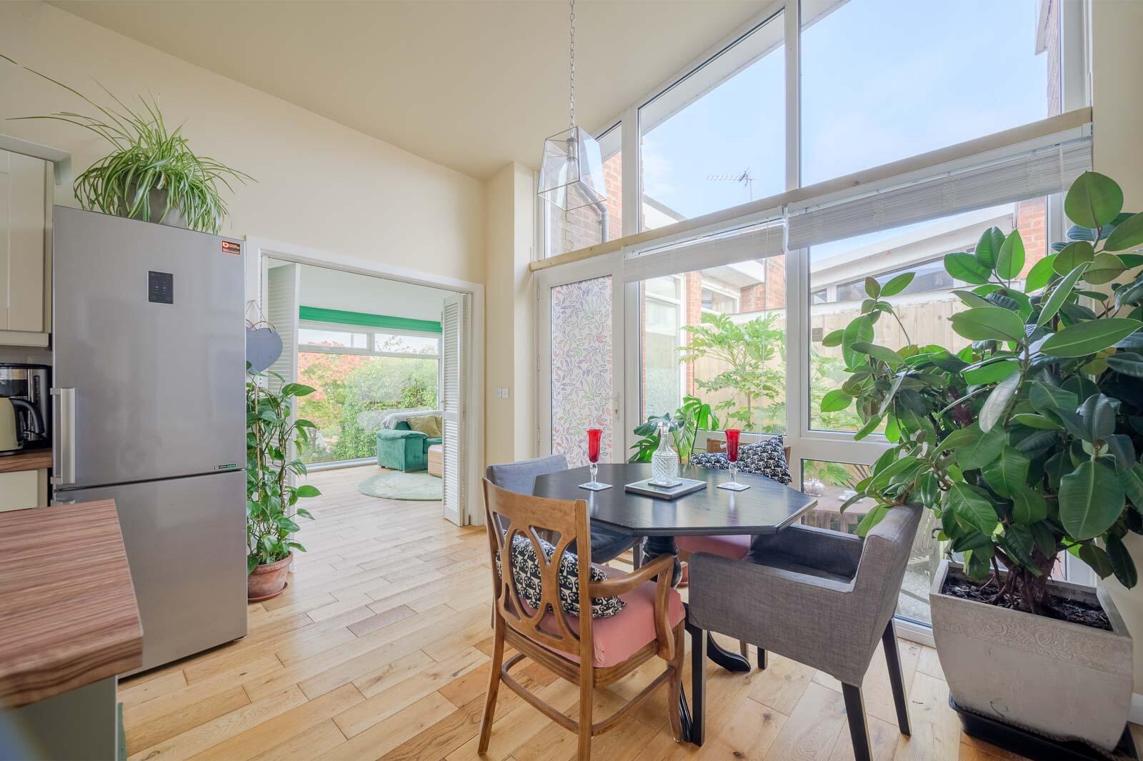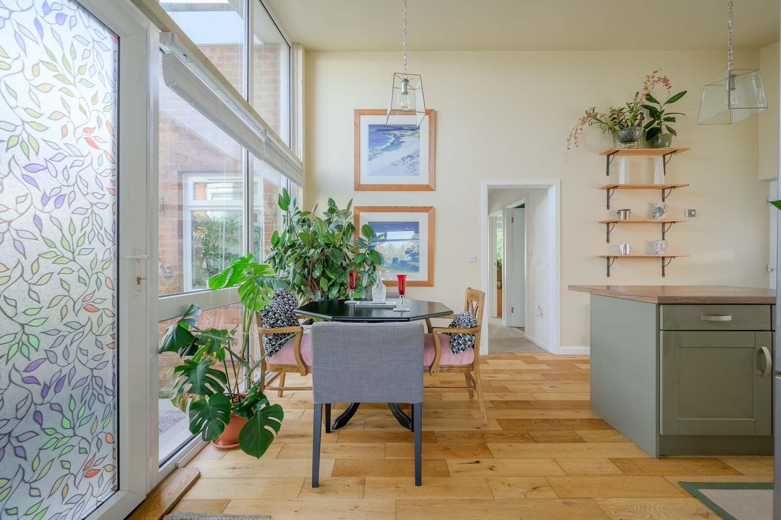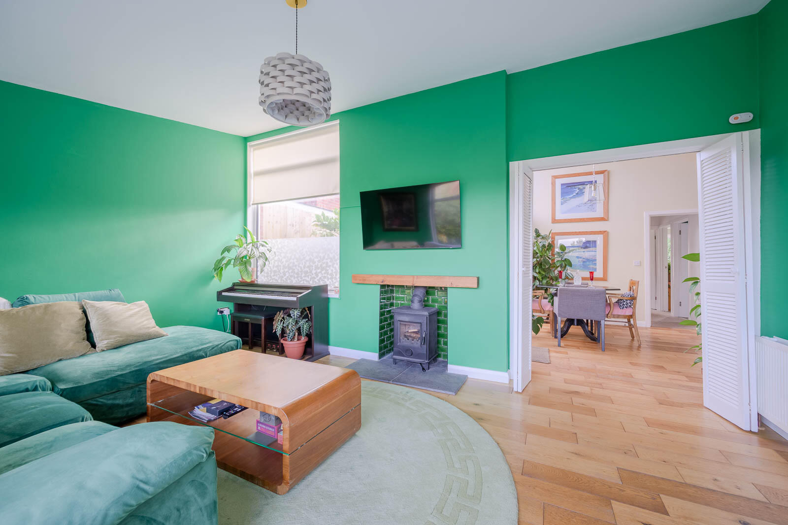 Vaulted ceiling. Solid oak flooring. Large spacious room with picture window with outlook to mature front garden, and leafy aspect to Ballymenoch Park, providing privacy and seamless blending of outdoors and in. Wood burning stove with slate hearth, tiled inset and floating timber mantel, sliding louvre doors leading through to kitchen/diner.