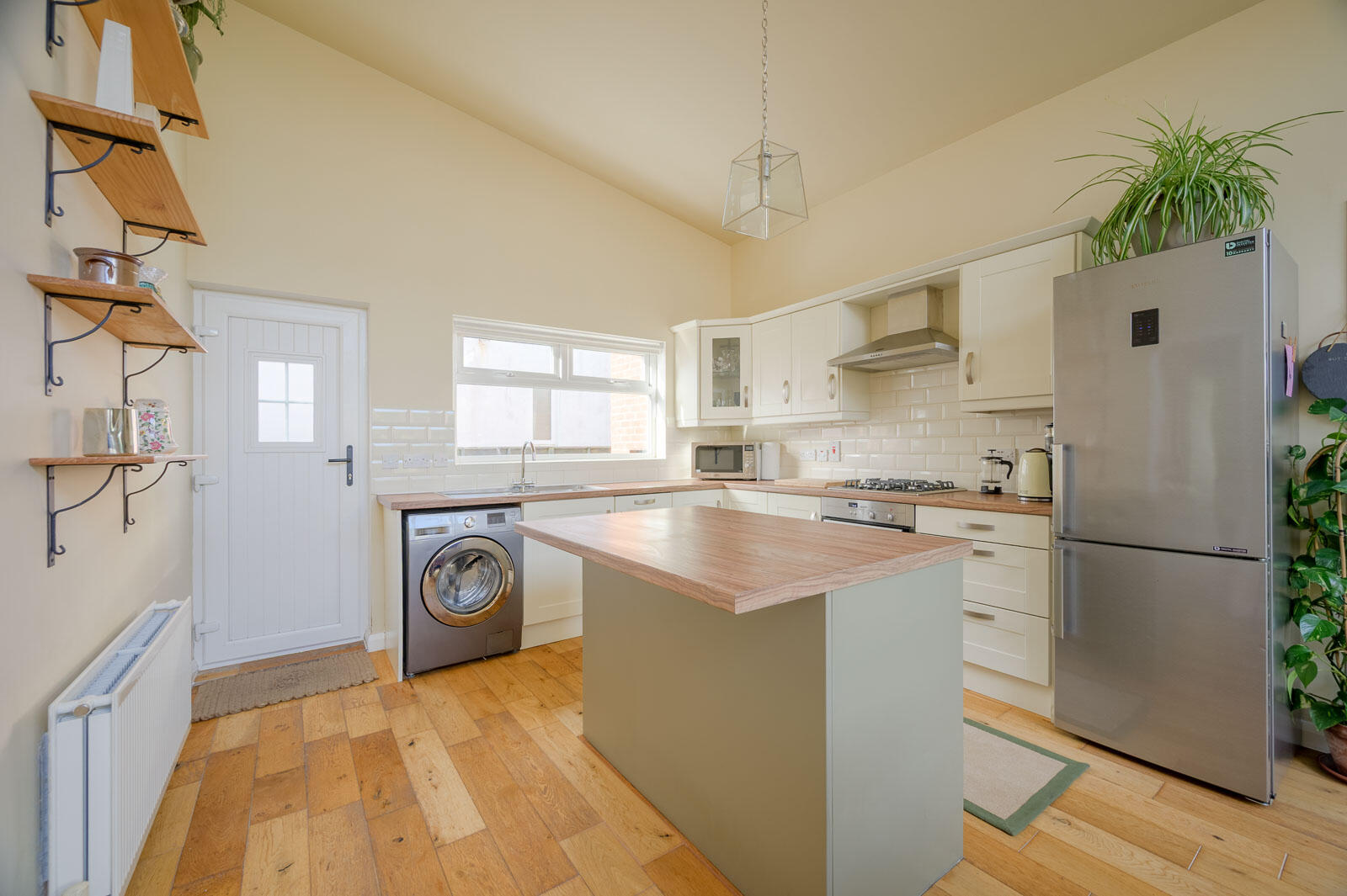 Double height vaulted ceiling. Solid oak flooring. Fully fitted kitchen with range of high and low level units, Neff fan assisted electric oven, integrated Bosch dishwasher, space for washing machine, stainless steel Franke sink and a half with drainer, mixer taps, subway style tiling, four ring Neff gas hob, extractor hood above, space for fridge freezer, island unit with casual breakfast bar dining area and additional storage below, double glazed access door to side patio and uPVC door with access to side with attached garage.