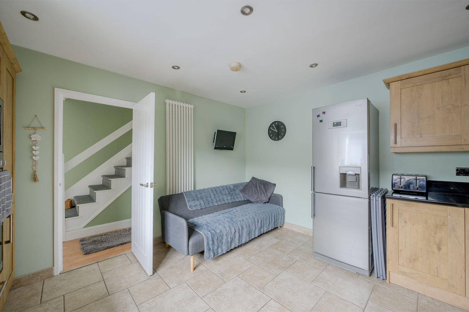 With laminate wood effect floor throughout, inset spotlights, storage under stairs.