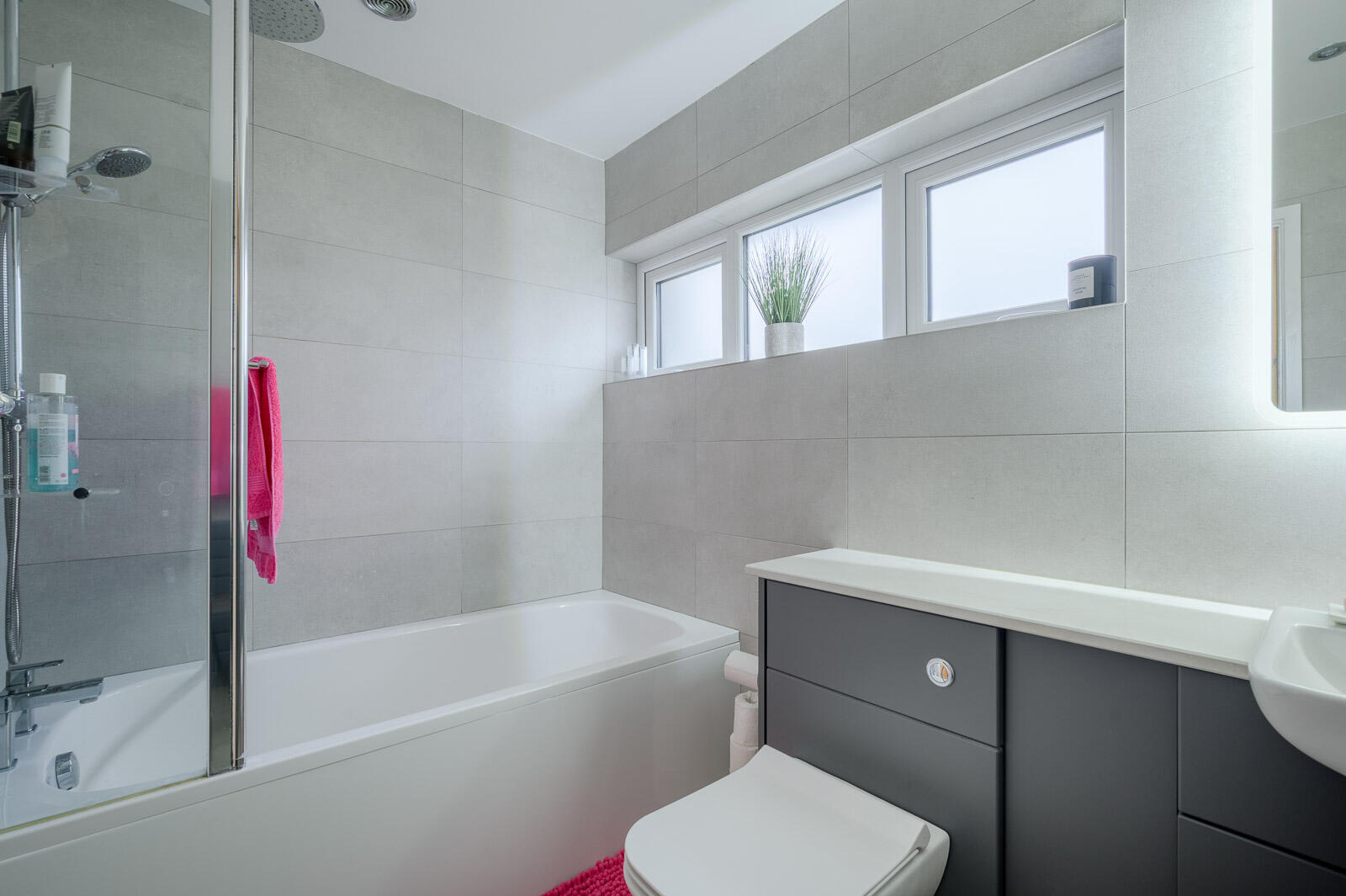 Plumbed for washing machine and dryer, tile wood effect floor and corner heated towel rail. Velux and back window frosted.