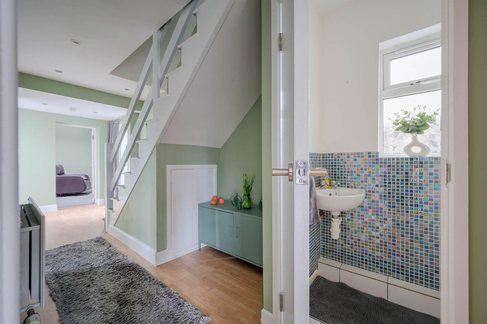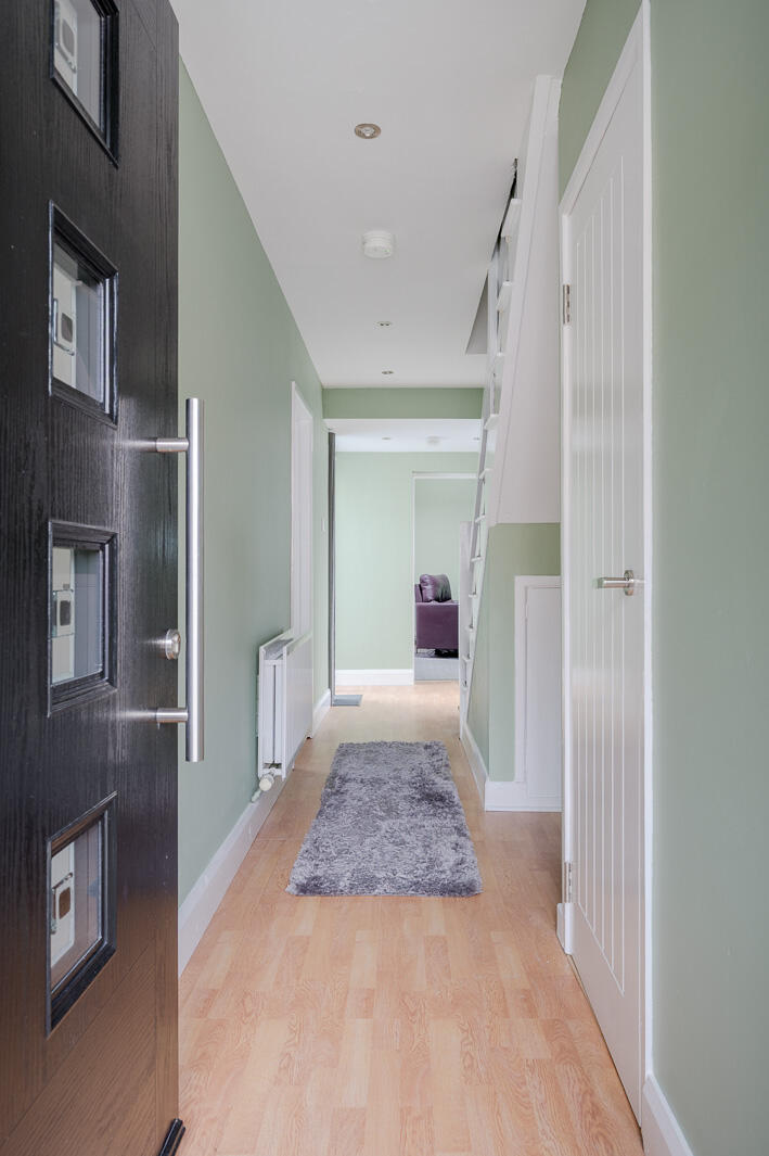 Laminate wood effect floor to rear hallway with access door to rear patio, outside tap, fully enclosed with new fence and additional access door to side entry. Both doors have frosted glass.