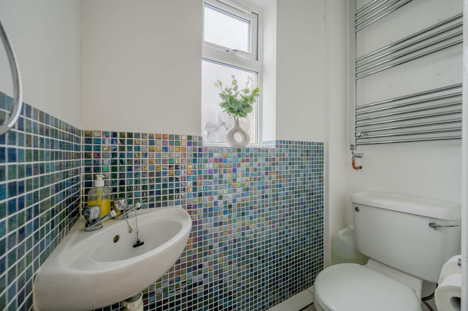 With low flush WC, corner wall hung wash hand basin with hot and cold taps, partial mosaic tiled walls, tiled floor, towel radiator.