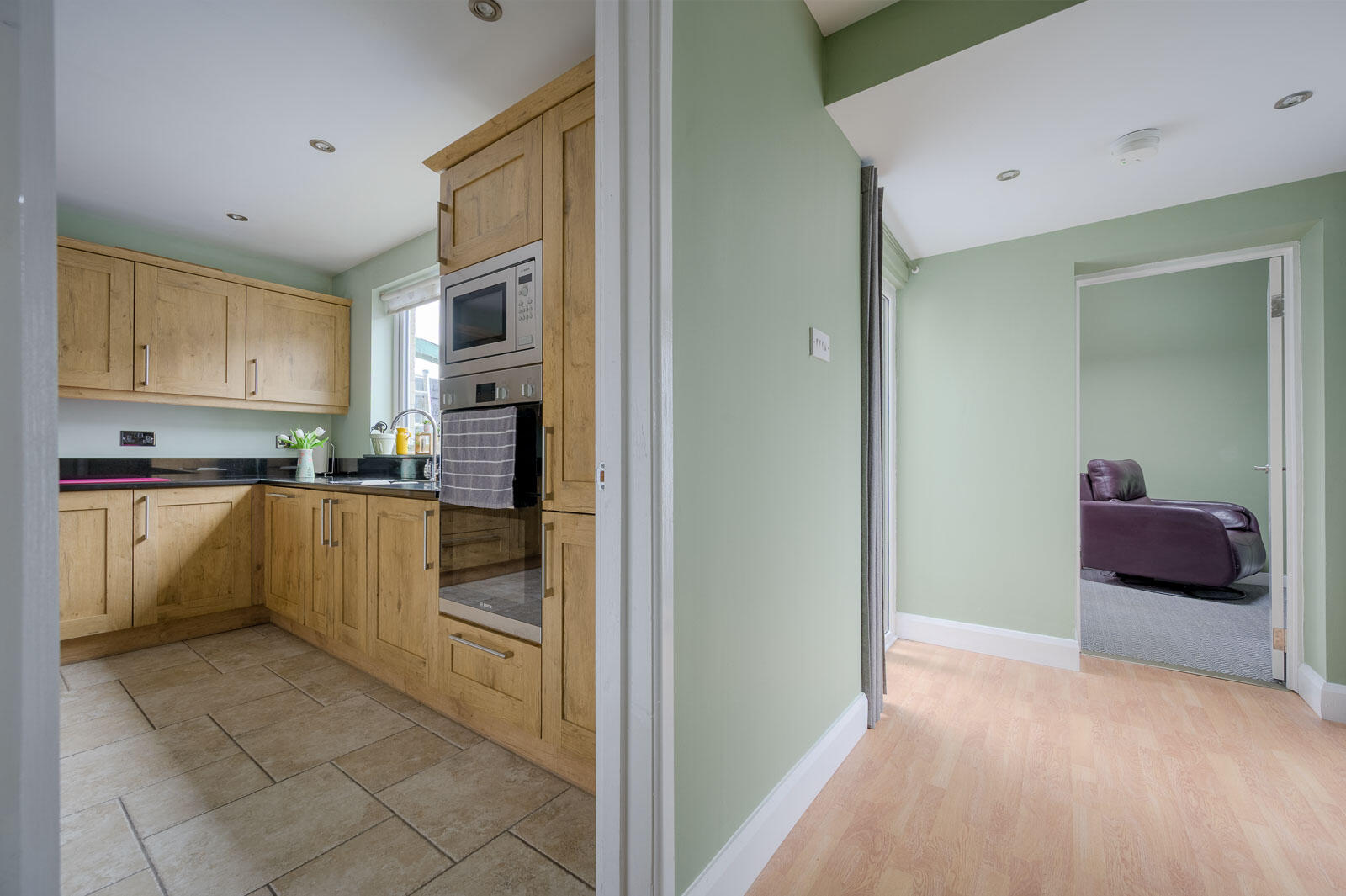 Kitchen with range of high and low level units, integrated dual oven, integrated microwave, granite work surface, splashback and windowsill, stainless steel sink with chrome mixer taps, outlook to rear courtyard, integrated dishwasher, four ring hob, stainless steel extractor, space for fridge freezer, tiled floor. Dedicated cupboard housing the cooker, hob and dishwasher sockets, keeping all electrical connections neatly concealed for a clean and uncluttered finish.