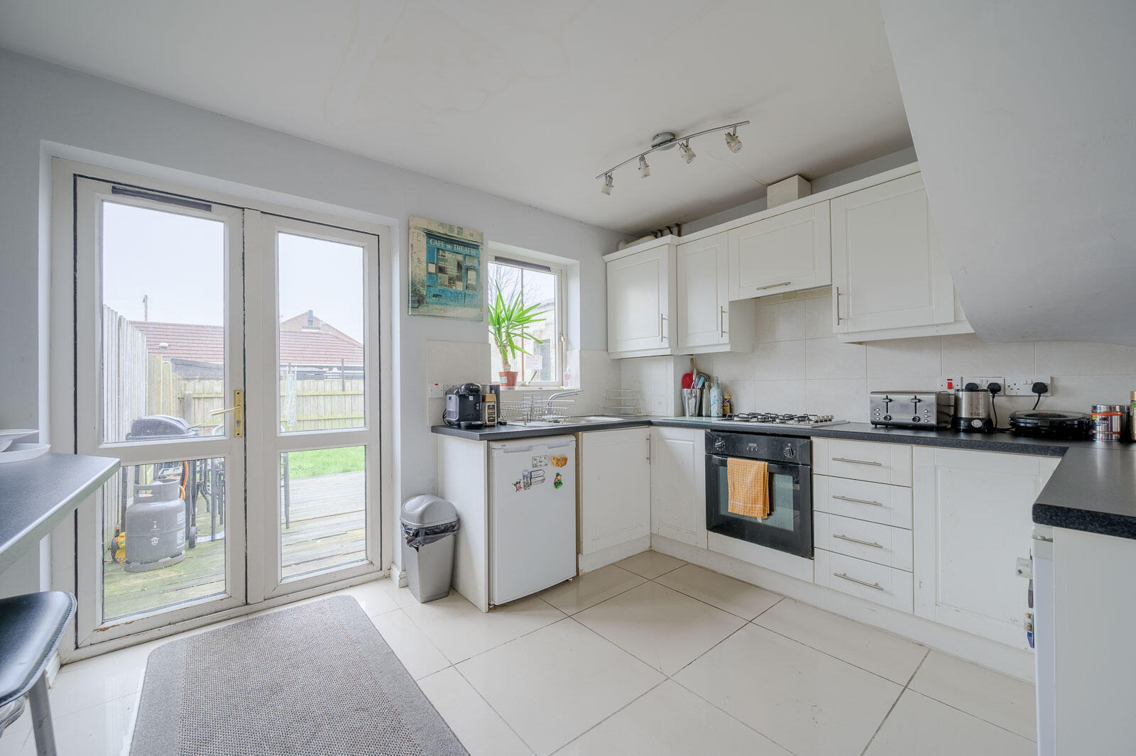 Range of high and low level units, integrated oven, four ring hob, space for under counter fridge, space for under counter freezer, concealed gas fired boiler, double doors to rear garden