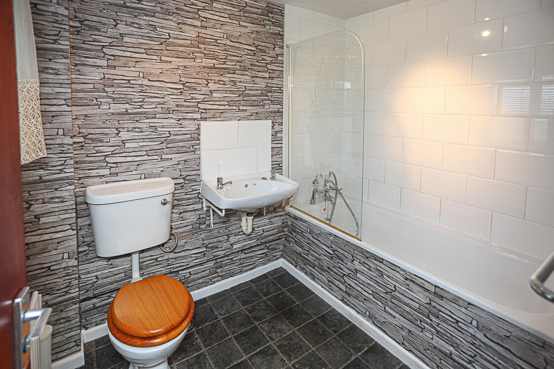 White suite comprising low flush WC, wash hand basin, tiled splashback, panelled bath with chrome antique style mixer taps, telephone hand shower, glazed shower screen, fully tiled splashback.