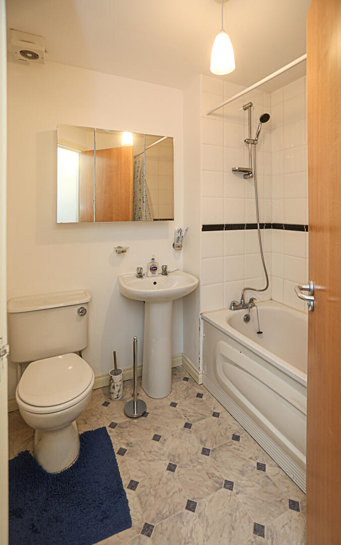 White suite comprising of low flush WC, pedestal wash hand basin with hot and cold taps, panelled bath with mixer tap and telephone handle attachment, partially tiled walls, laminate tile effect floor.