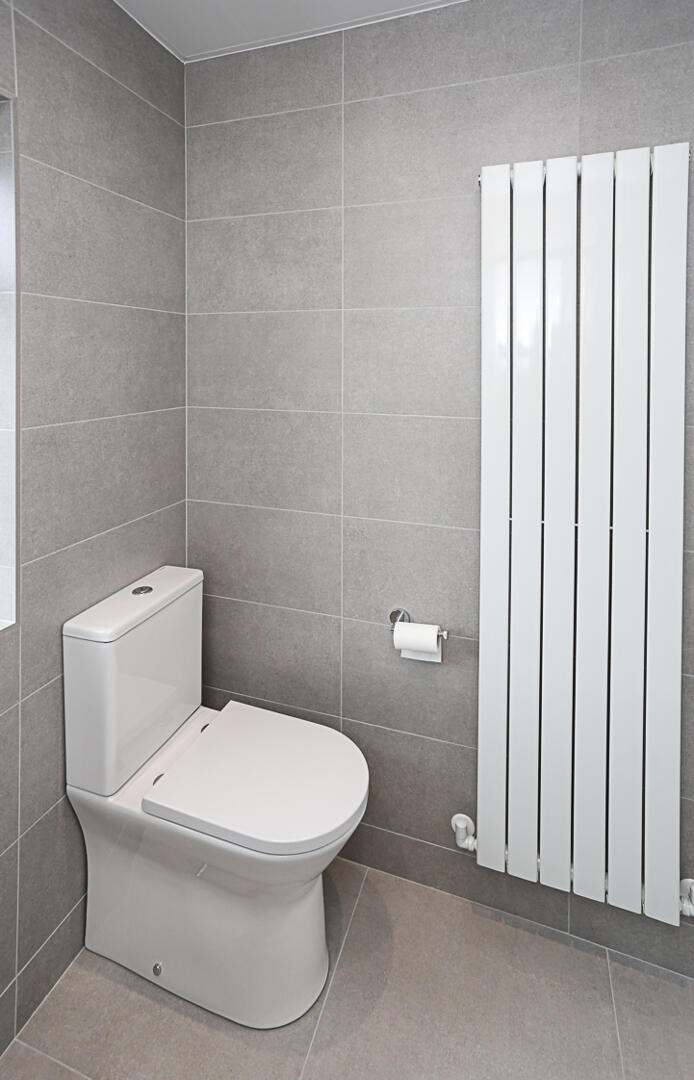 Modern ground floor shower room with contemporary white suite and walk-in shower