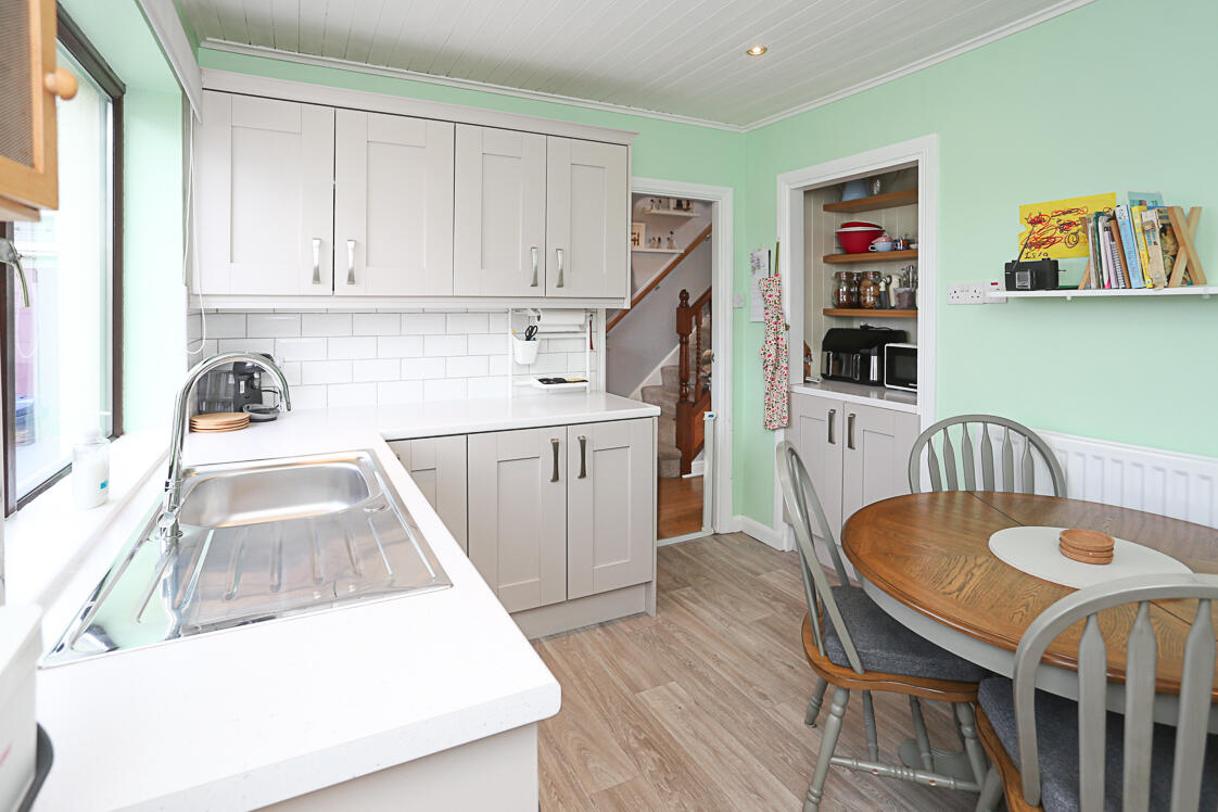 Range of high and low level units, space for fridge freezer, four ring hob, stainless steel and glazed extractor above, subway style white tiling splashback, integrated oven, space for washing machine, laminate granite effect work surface, stainless steel sink and drainer with chrome mixer taps, outlook to rear garden, bespoke fitted pantry cupboard units.