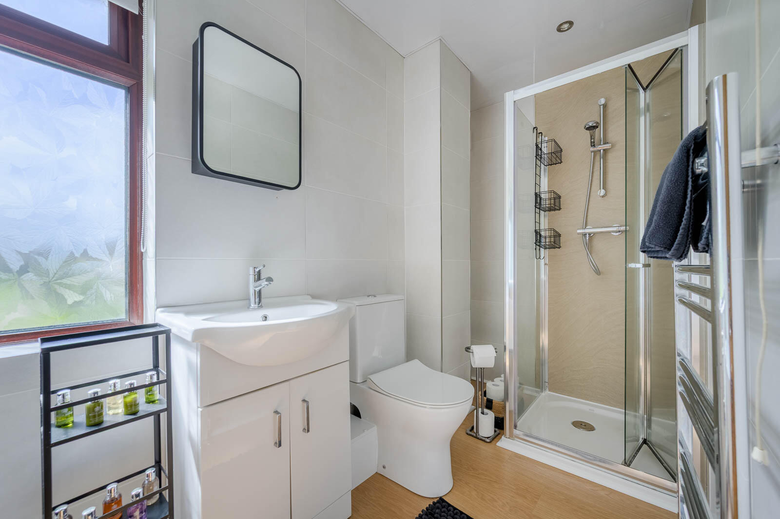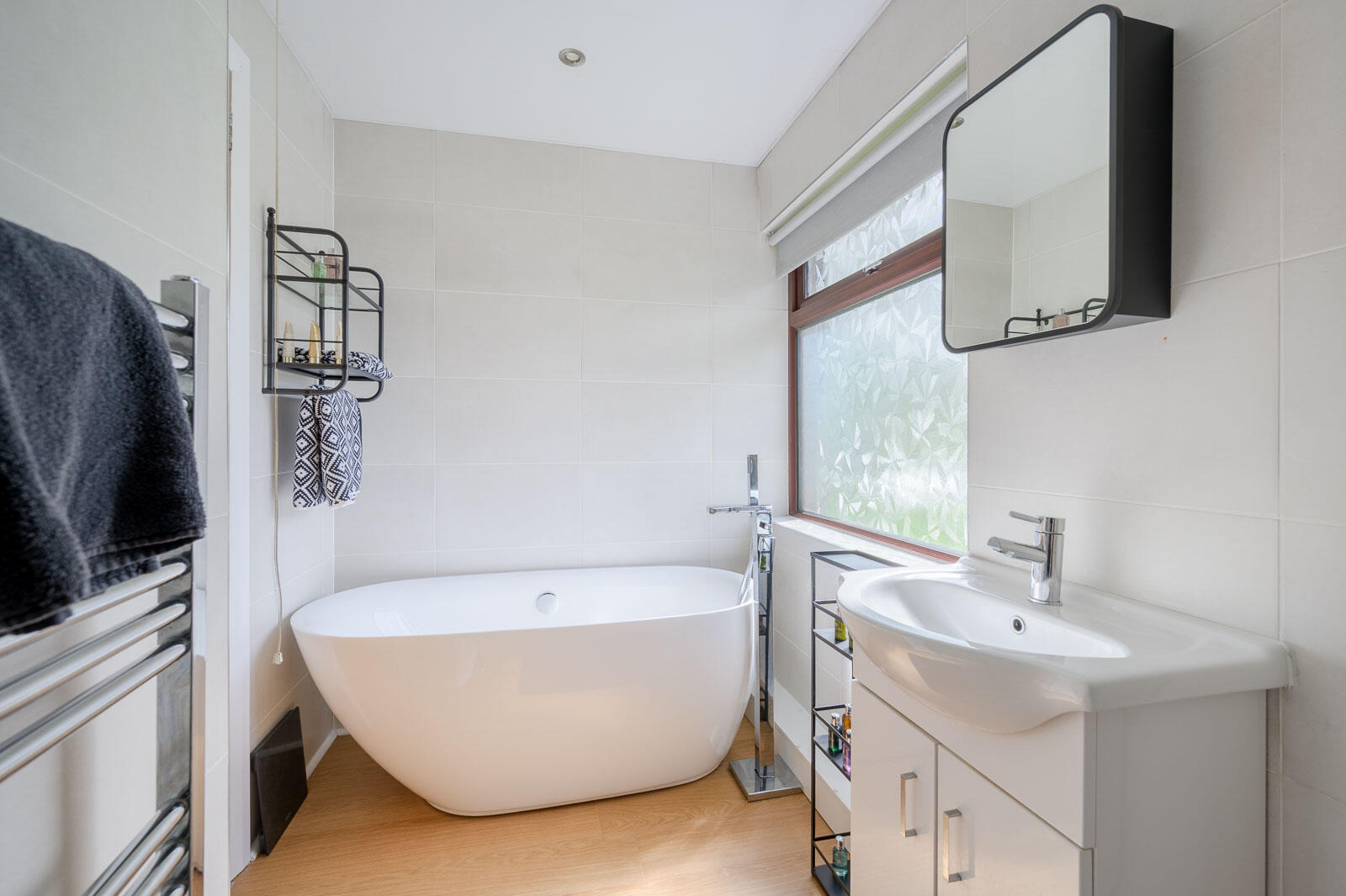 White suite comprising of low flush WC, wall hung wash hand basin, chrome mixer taps, vanity storage below, free standing contemporary bath with feature free standing mixer tap and telephone handle attachment, walk-in thermostatically controlled shower, telephone handle attachment, uPVC panelling, glazed shower screen, chrome heated towel rail, tiled walls, laminate wood effect floor.
