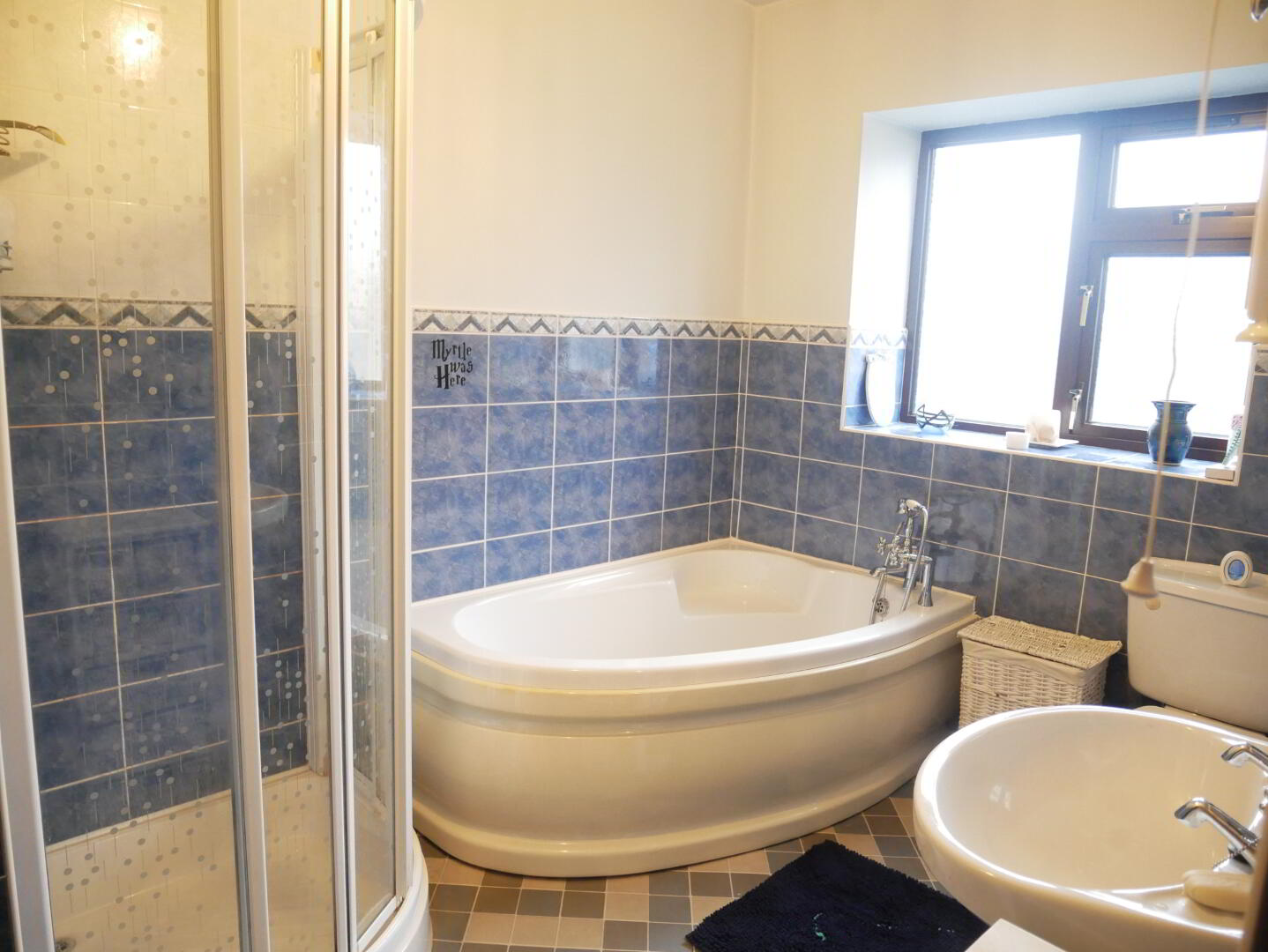 Bathroom - Fully tiled walk in mains shower cubicle, corner bath with telephone hand shower attachment, WC, wash hand basin, half tiled walls, cushion flooring, hotpress.
