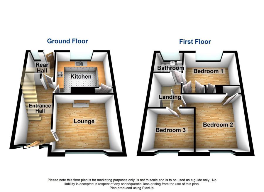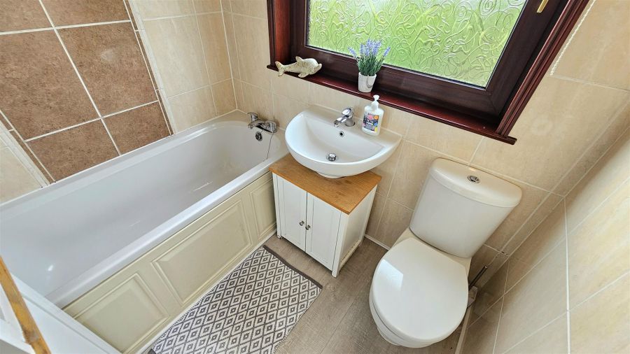 Double glazed window to rear aspect, white suite comprising low flush WC, pedestal sink, enclosed bath with shower over, fully tiled walls, chrome heated towel rail, laminate wood flooring.