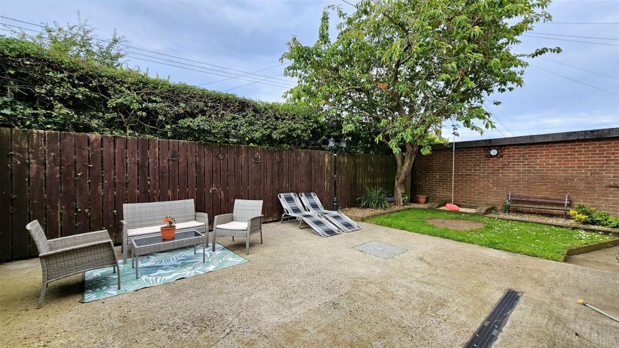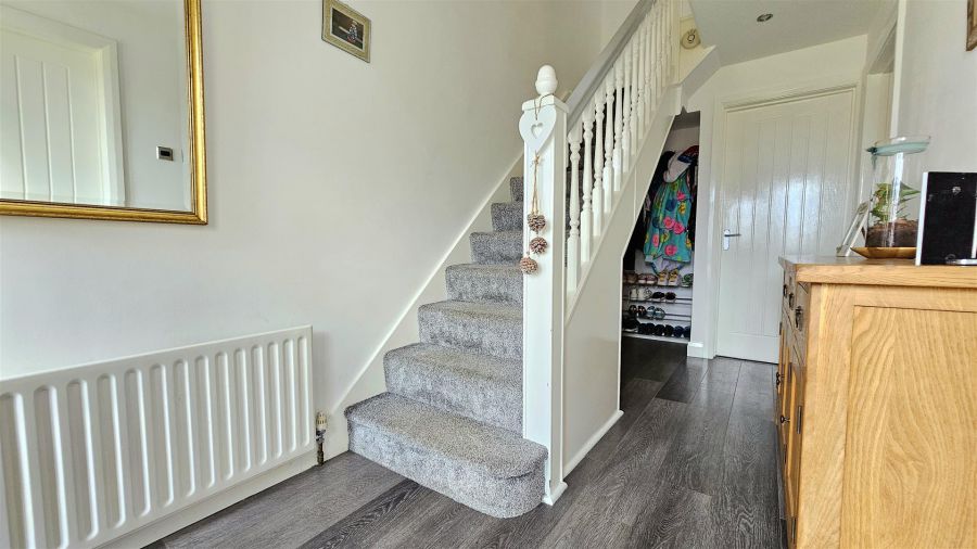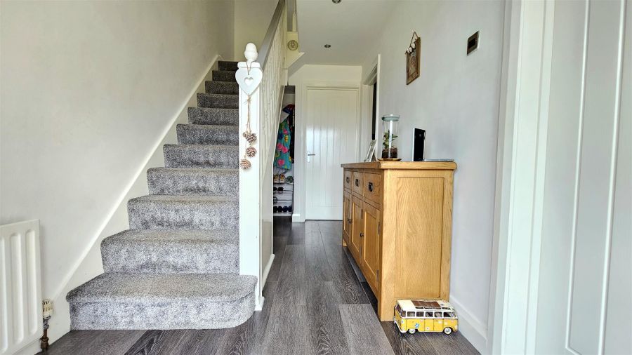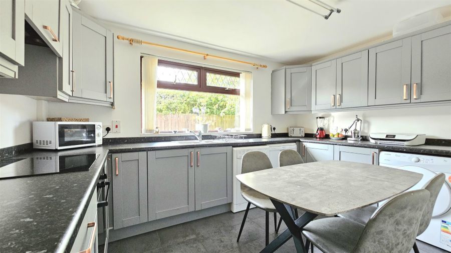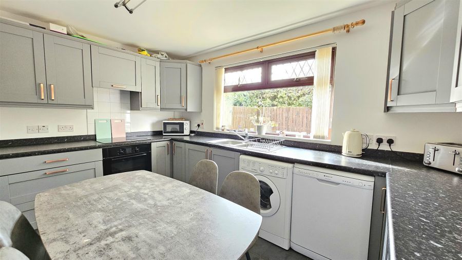 Double glazed window to rear aspect, range of grey shaker style units with roll edge worktops, inset stainless steel 1.5 bowl sink and drainer with mixer tap over, built-in oven and four ring ceramic hob with extractor fan over, plumbed for washing machine and dishwasher, storage cupboard, radiator, ceramic tiled floor, hallway with door to rear garden