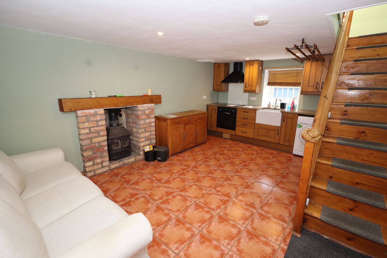 Including staircase, brick fireplace. Range of high and low level oak units, granite