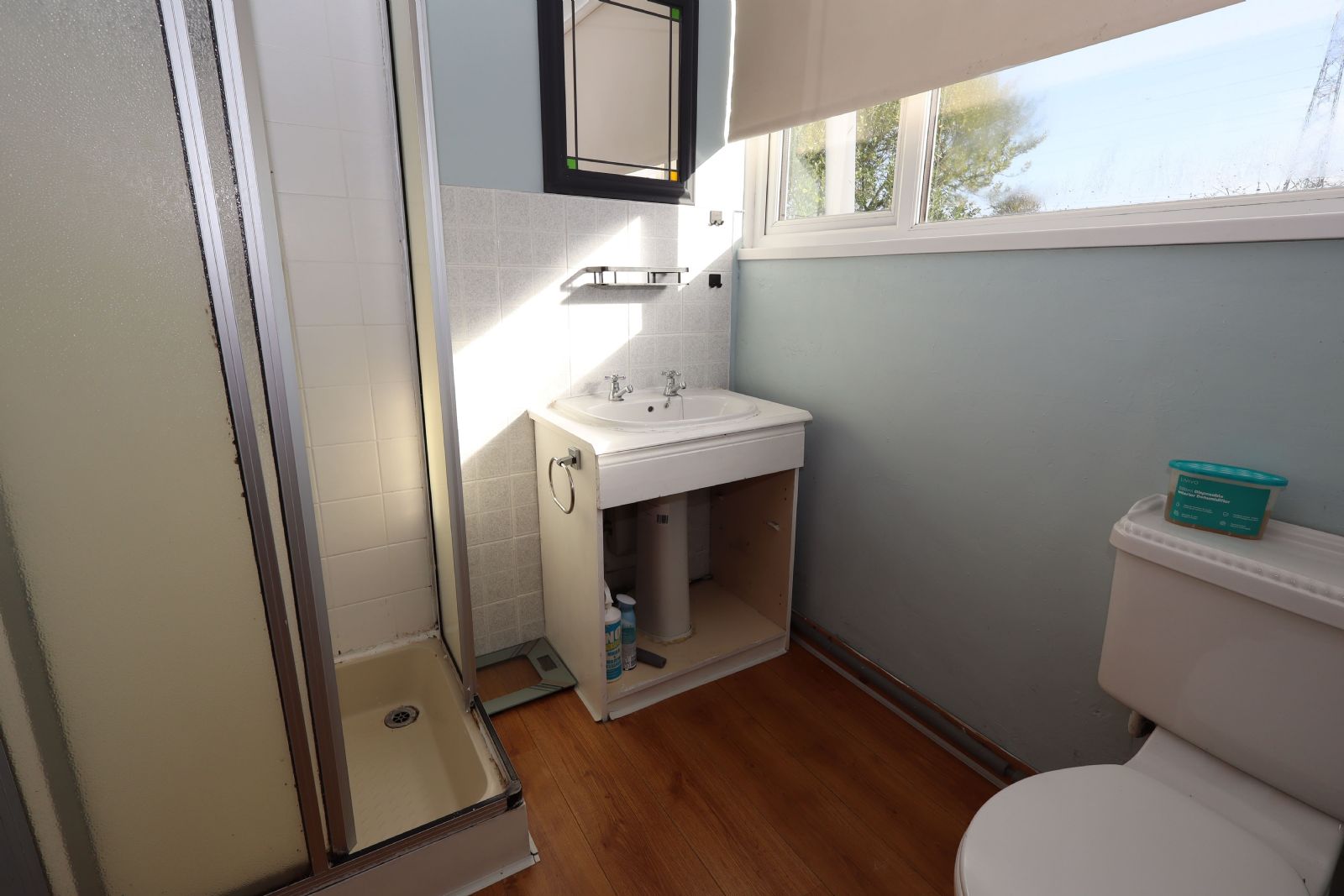 pedestal wash hand basin, low flush W/C, laminate wood flooring, wall tiling