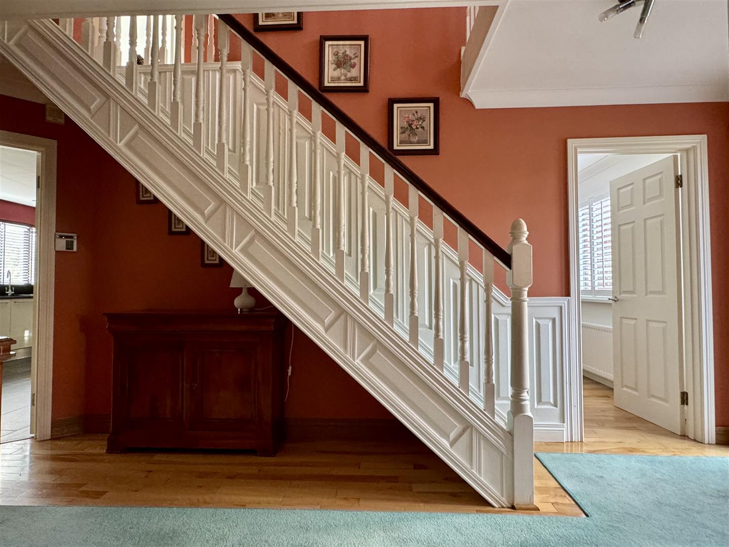 GROUND FLOOR Composite front door with double glazed full height twin side screens into: a well presented spacious entrance hall. Quality hardwood strip flooring extending through principal reception rooms. Feature painted panelled accent wall on staircase.