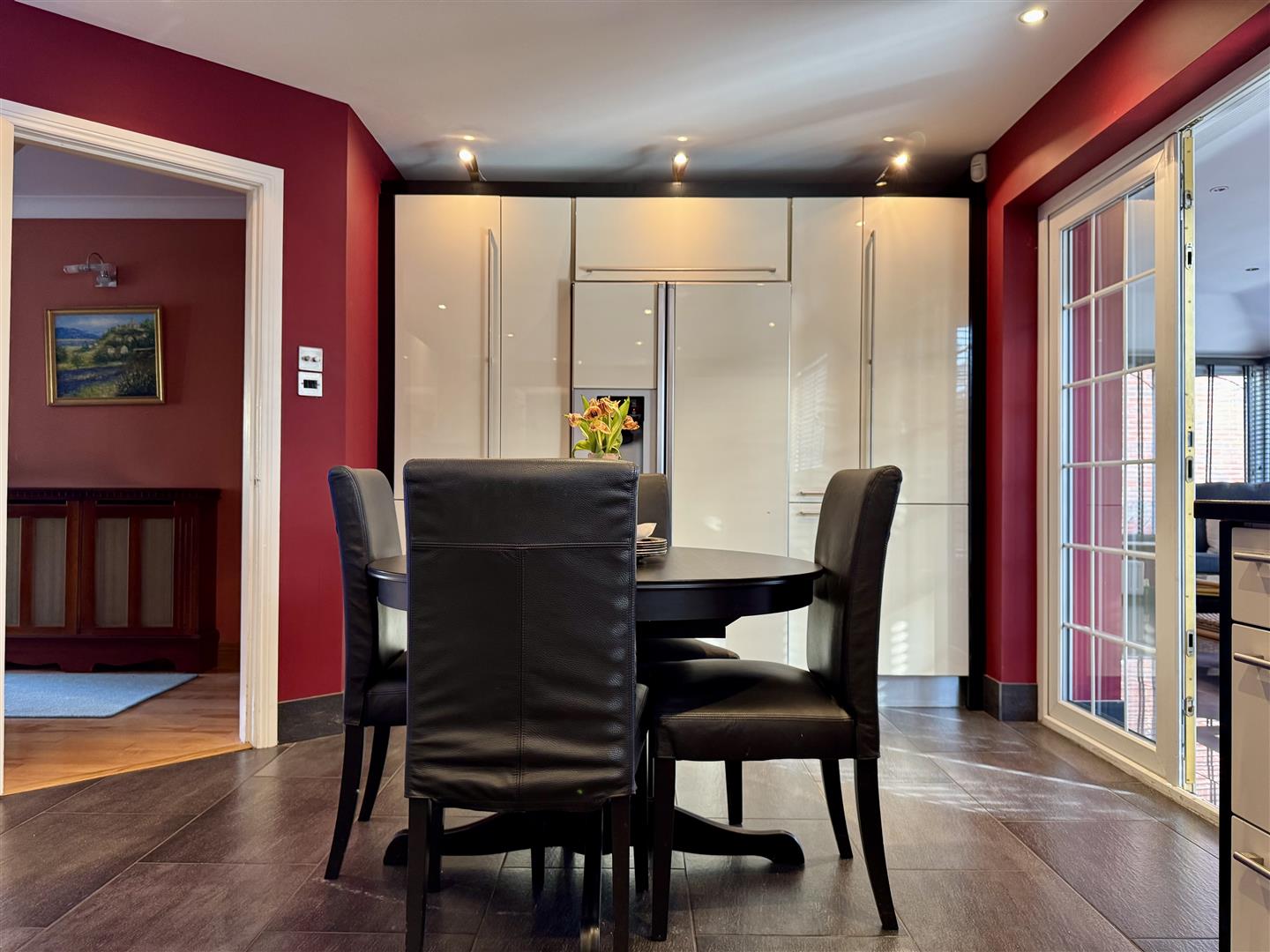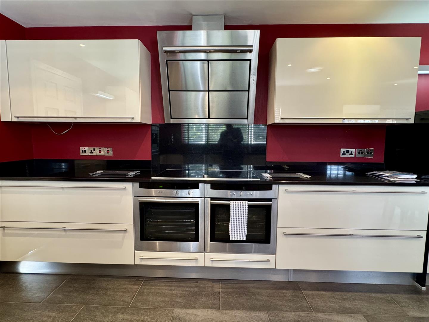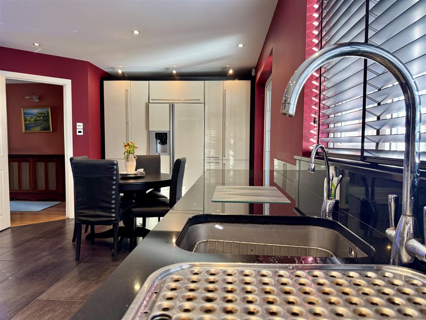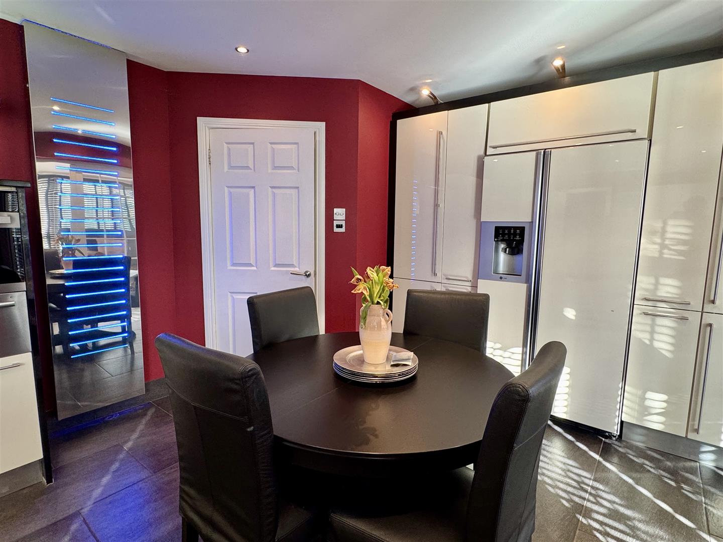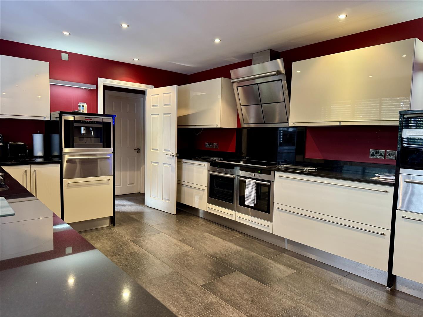 CONTEMPORARY OPEN PLAN KITCHEN WITH DINING 21'7 X 11'6 (6.58m X 3.51m) Approx. Equipped with a comprehensive range of high and low level modern fitted units in gloss white finish with contrasting granite work surfaces, upstands and splashback. Inlaid stainless steel sink unit with swan neck mixer tap. A host of integrated appliances including, twin Neff under ovens, five ring halogen Neff hob with modern angled stainless steel extractor fan. Eye level Hotpoint oven with Neff plate warming drawer, Kupperbusch coffee machine with Neff warming drawer. Plumbed for dishwasher. Housing for freestanding colour coded American style fridge freezer (Included). Recessed low voltage lighting. Tiled floor extending through to utility and cloakroom