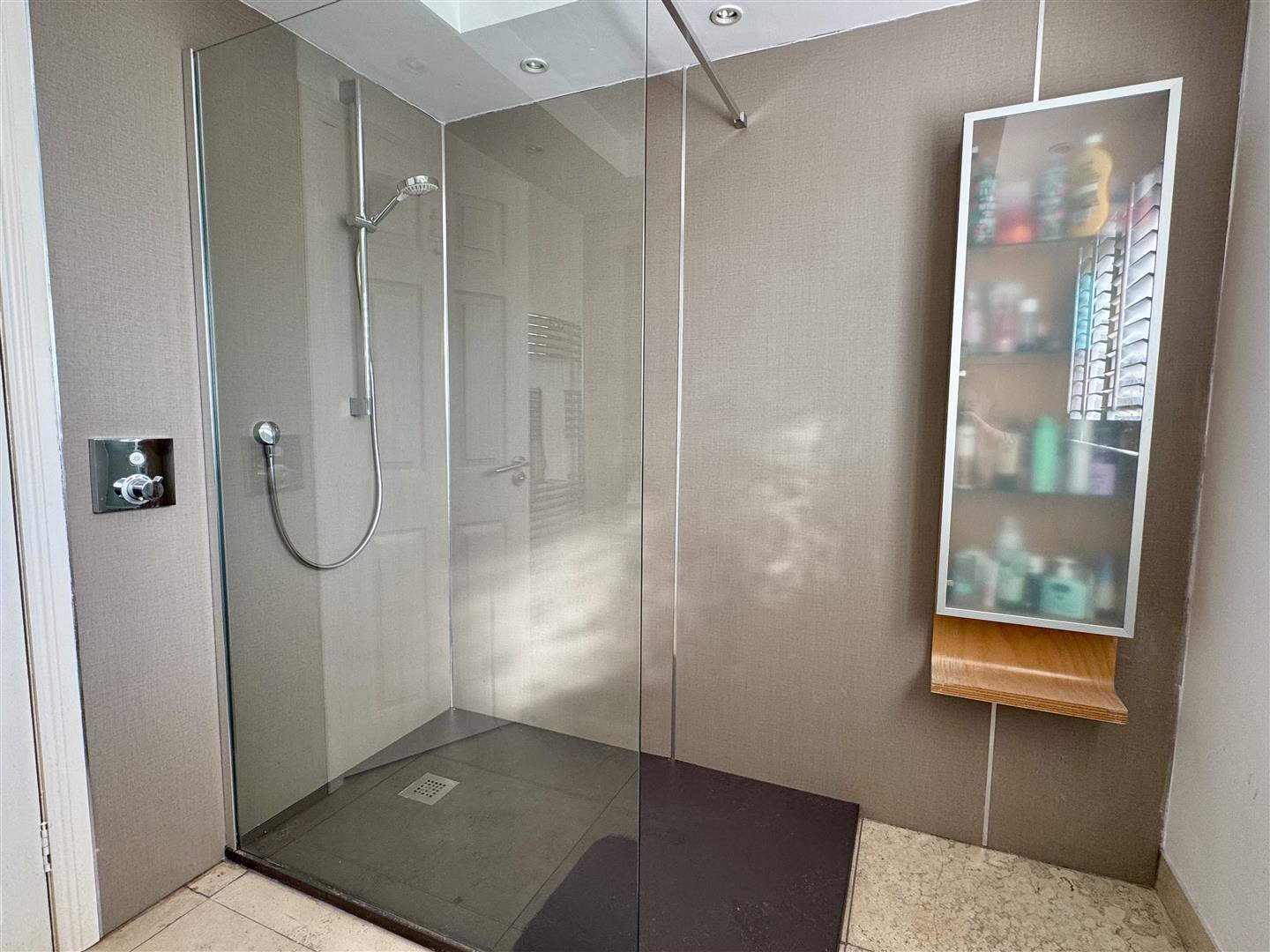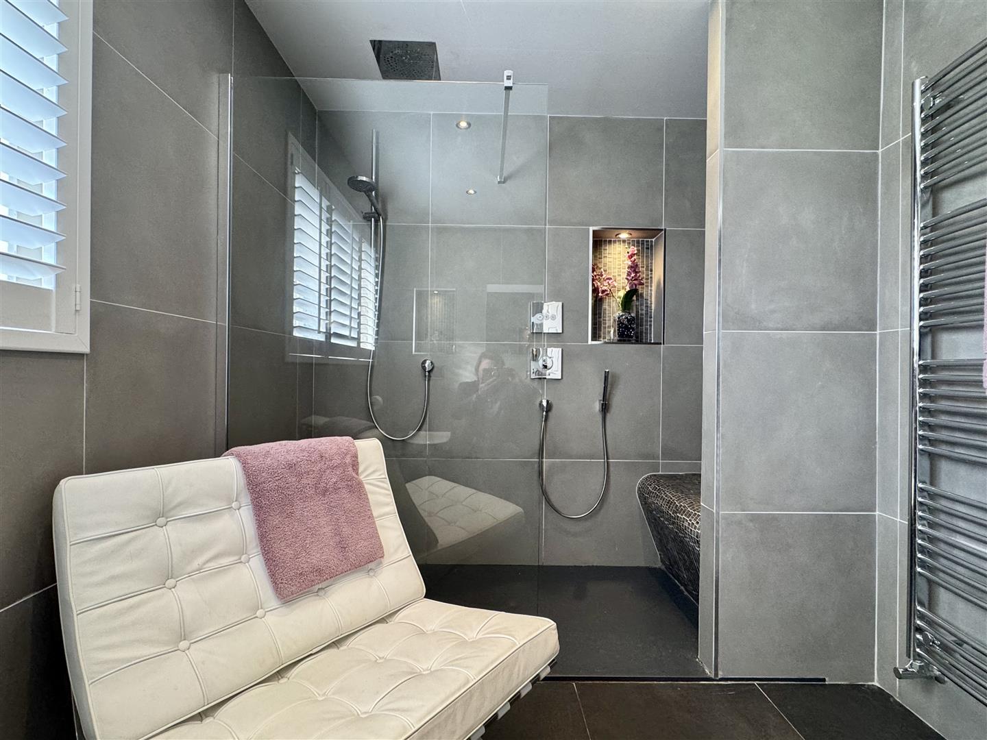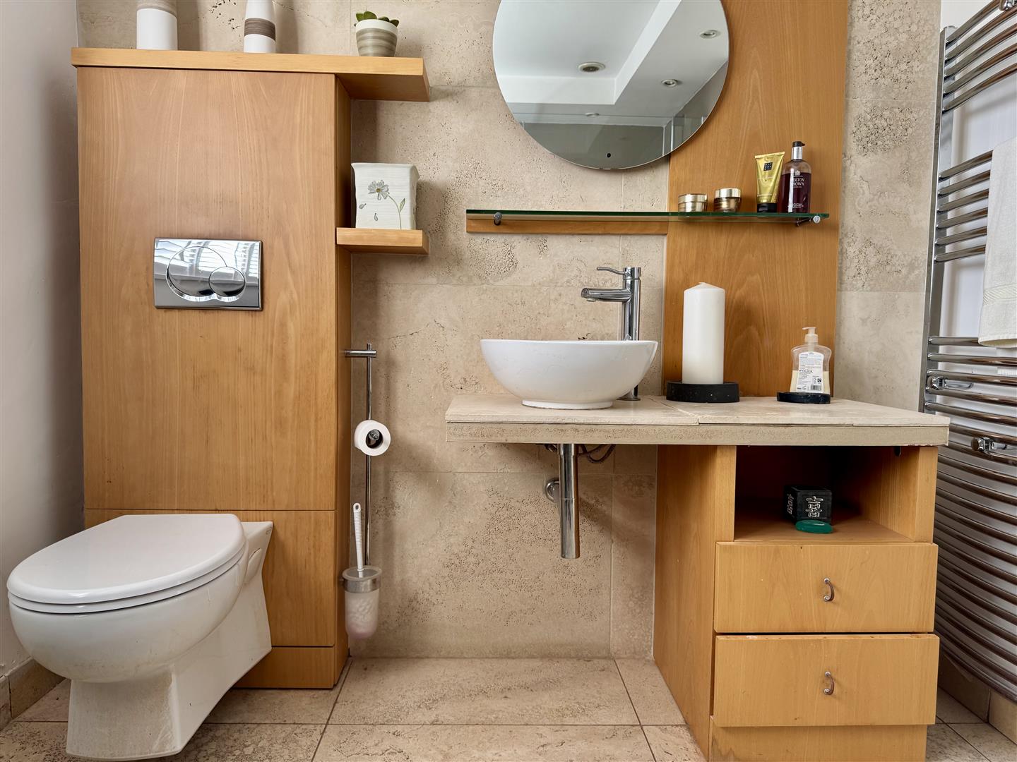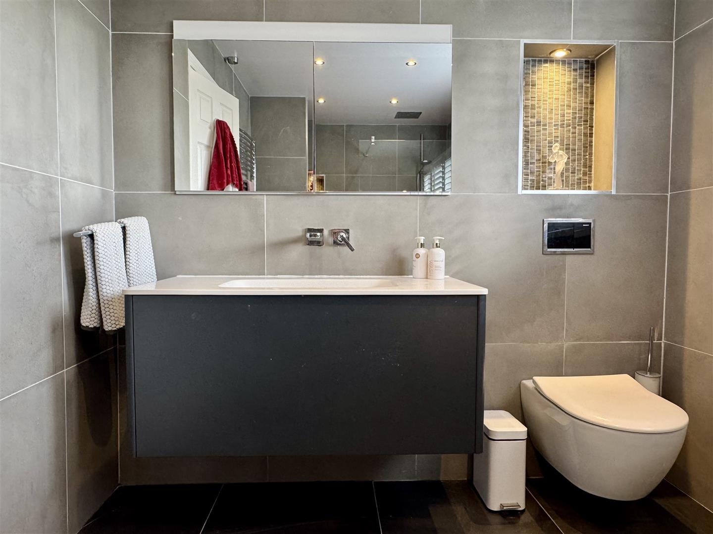 LUXURY FAMILY BATHROOM Comprising Geberit wall push w.c, ceramic bowl sink with mono block tap on natural stone plinth and oak panelling and drawers. Large open shower enclosure with full height self cleaning glass screen. Tiled floor with matching tiled accent wall