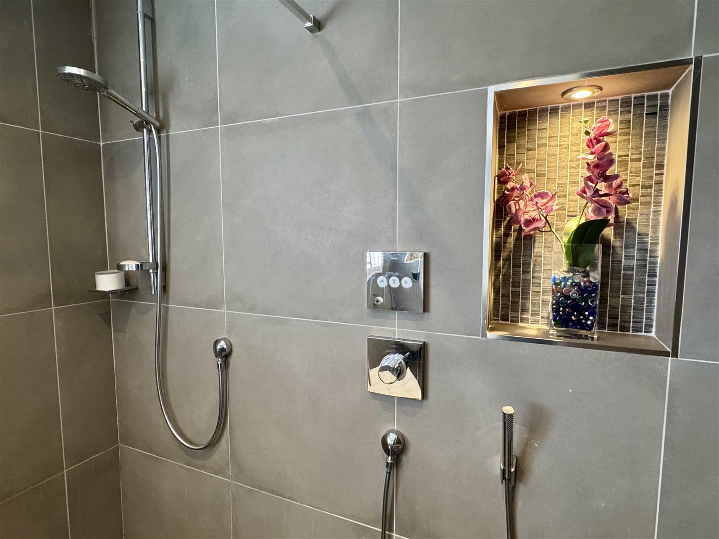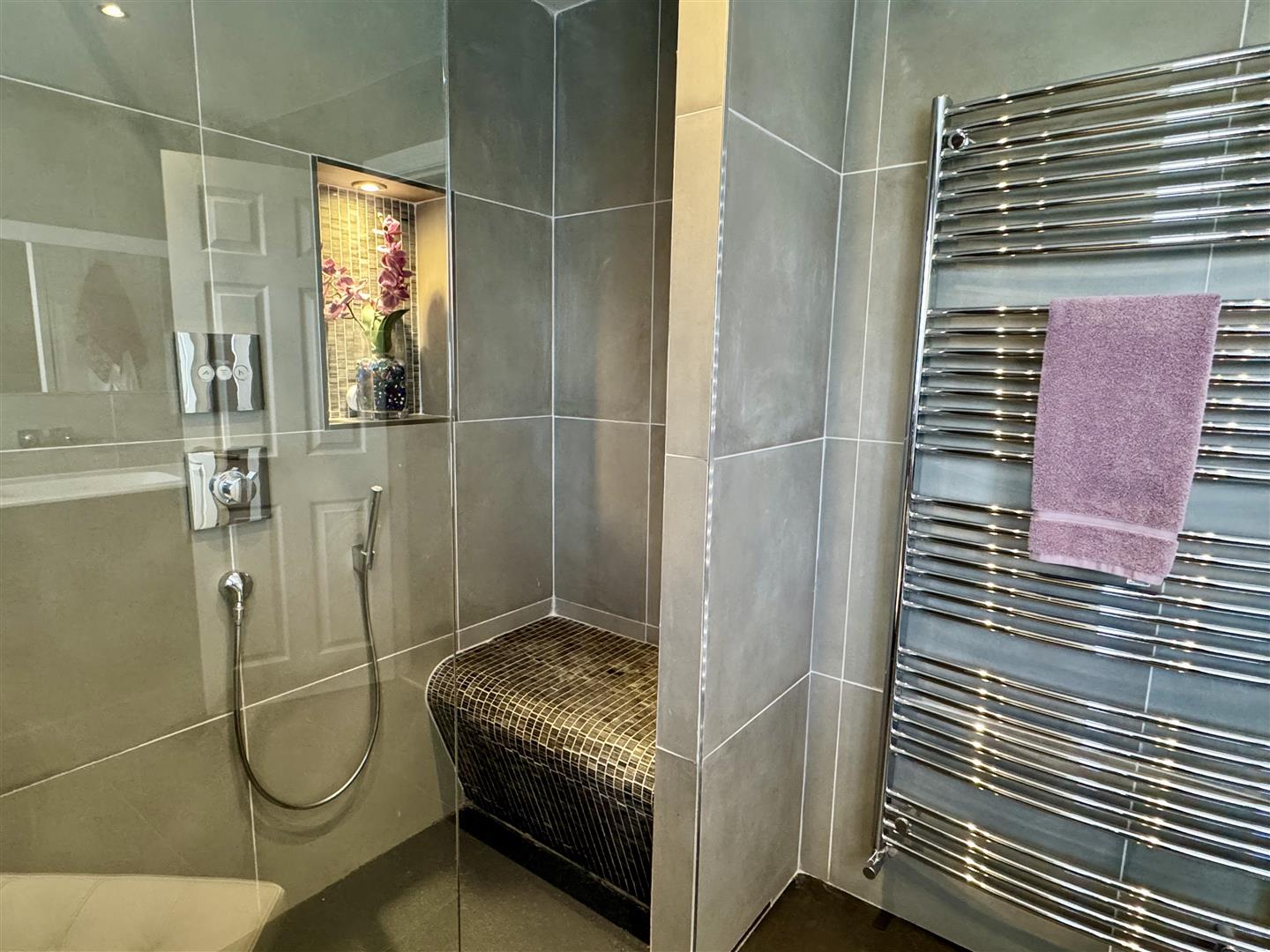 DELUXE WET ROOM STYLE EN SUITE Comprising floating modern vanity unit with waterfall type tap. Geperit wall push w.c, large walk in shower enclosure with full height self cleaning glass screen. Fixed shower with additional hand held shower attachment. Fixed bench style seat. Fully tiled walls and tiled floor