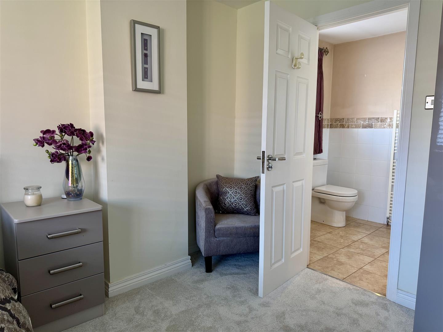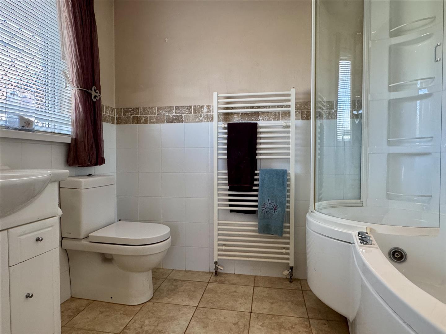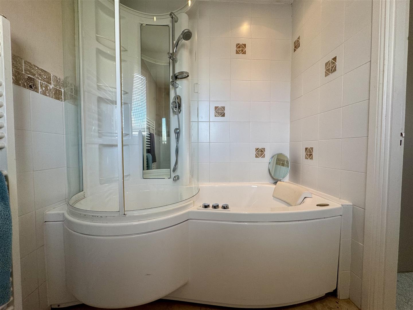 EN SUITE Comprising vanity unit in gloss white finish with mono block tap. Button flush w.c, 'P' shape Jacuzzi whirlpool bath with fixed curved shower enclosure. Fully tiled walls. Tiled floor.
