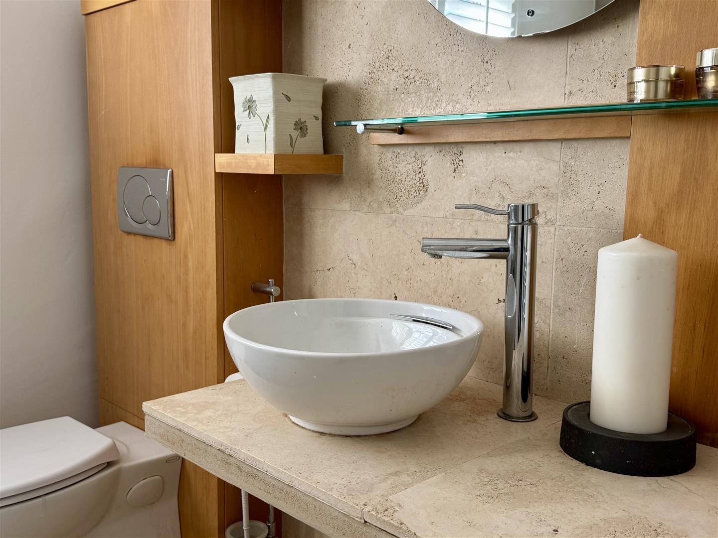 FURNISHED MODERN CLOAKROOM Comprising Geberit wall push w.c, semi pedestal wash hand basin with mono bloc tap and granite splashback