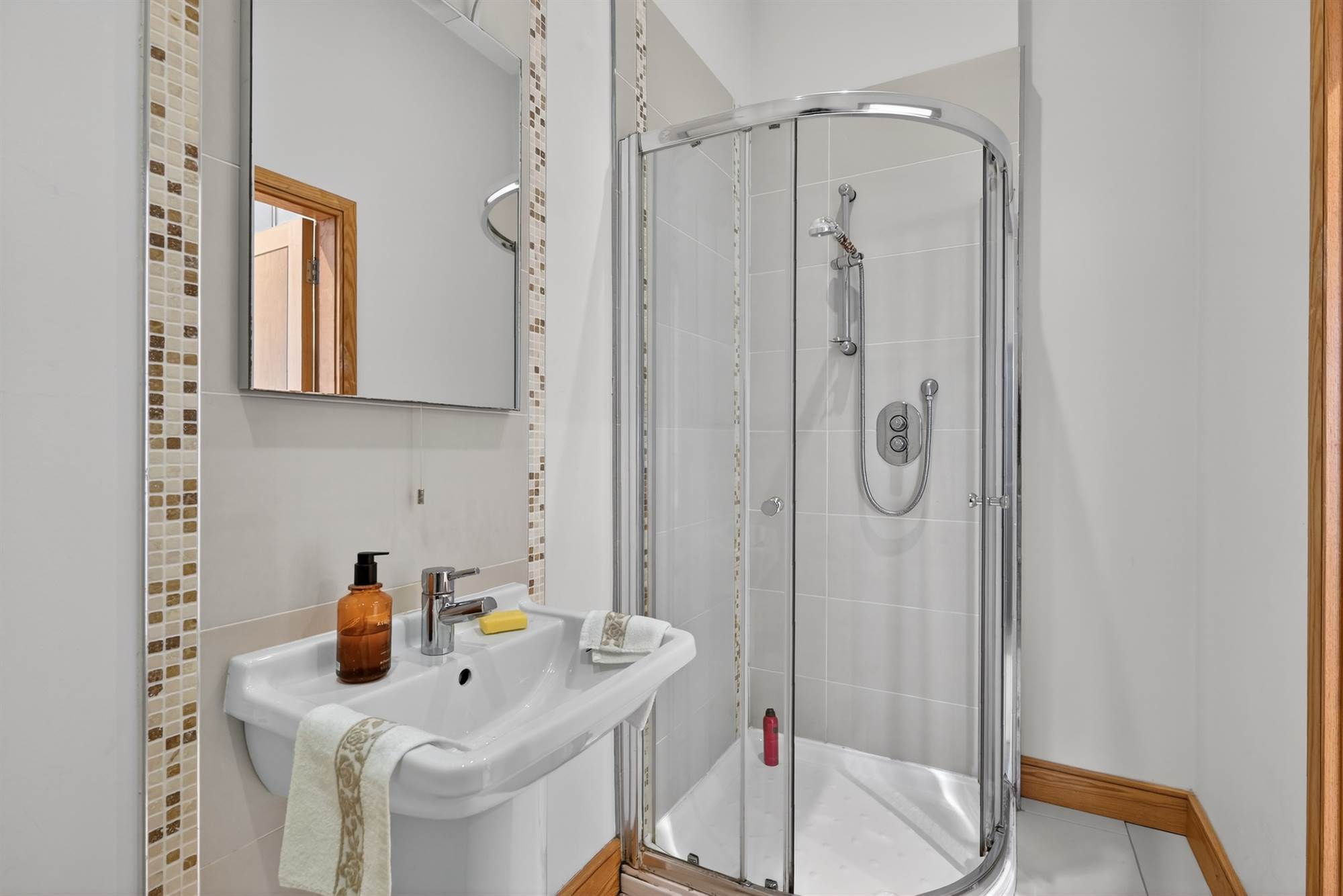 White suite comprising low flush wc, half pedestal wash hand basin, fully tiled shower cubicle, part tiled walls, tiled floor, chrome heated towel rail.