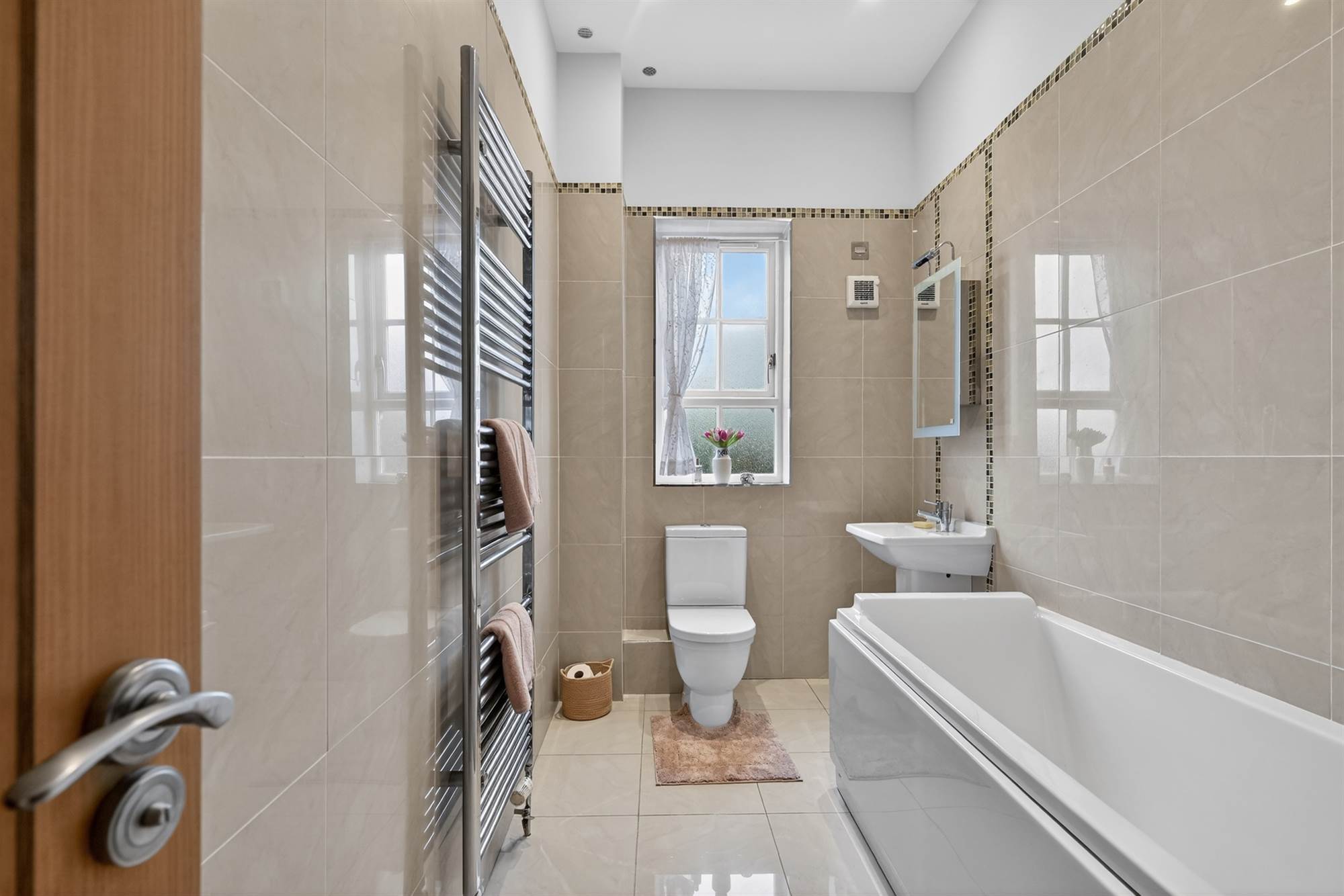 Modern white suite comprising panelled bath with mixer tap and telephone hand shower, half pedestal wash hand basin, low flush wc, majority tiled walls, tiled floor, chrome heated towel rail, low voltage spotlights.