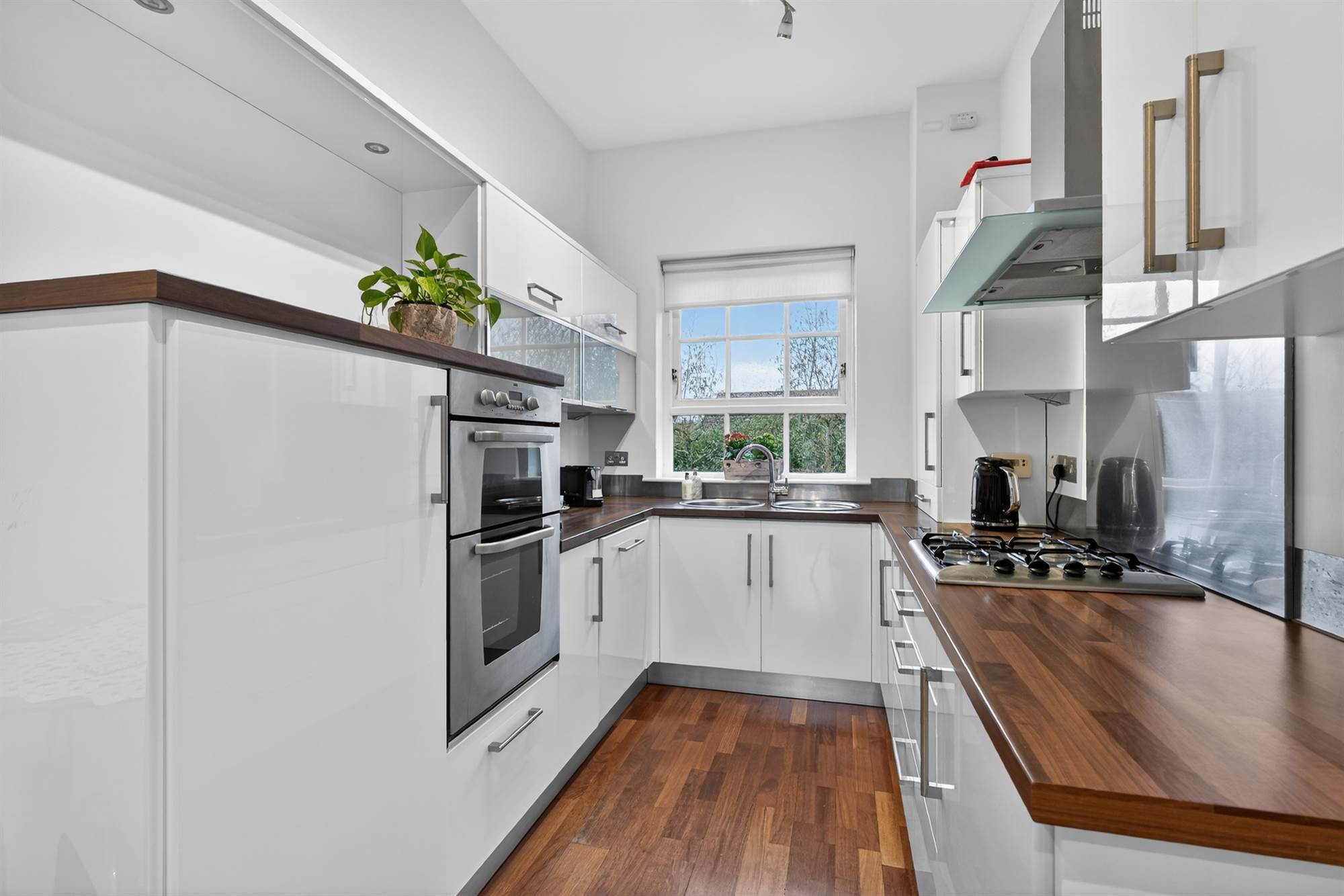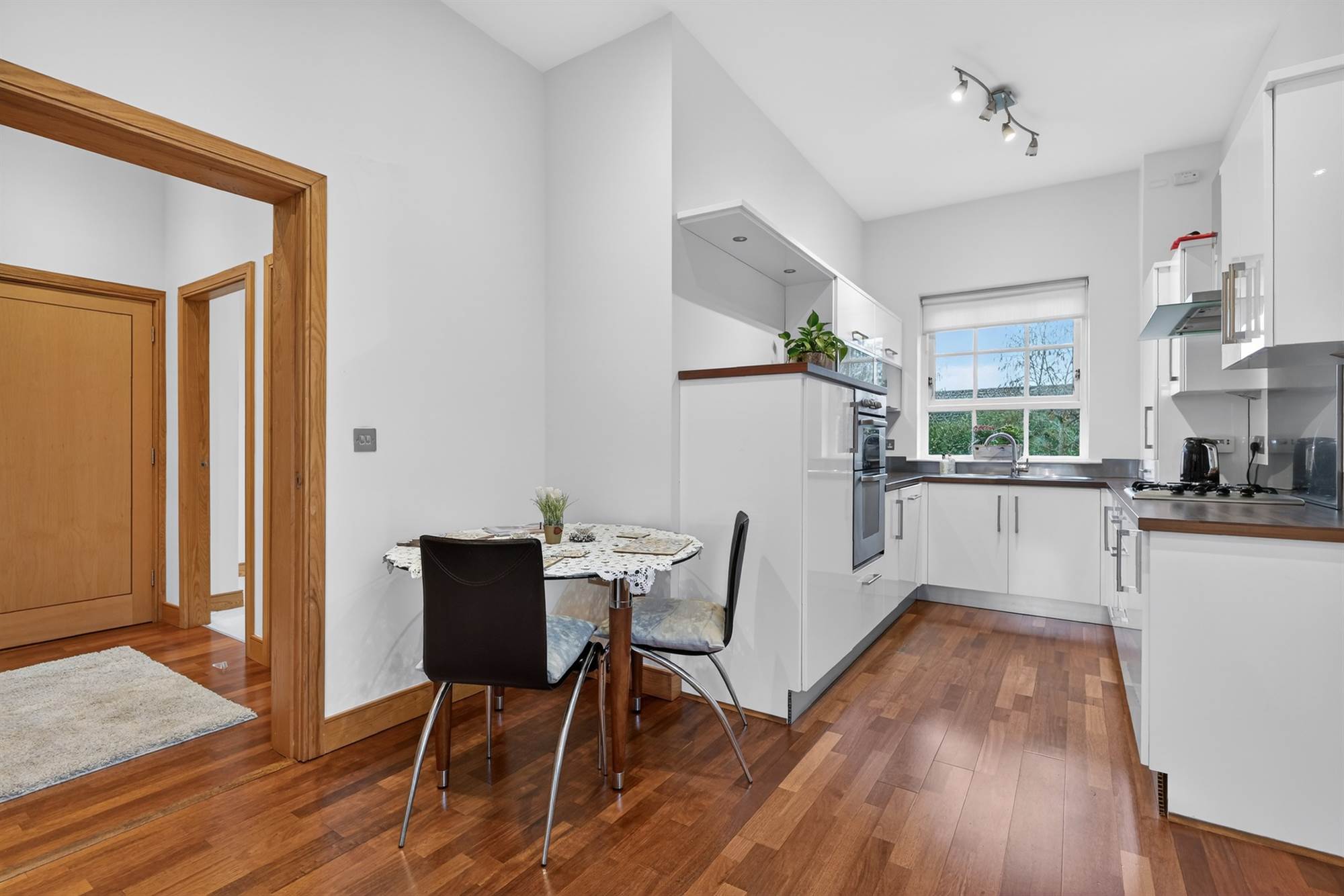 (at widest points). Modern fitted kitchen with range of high and low level units, four ring gas hob with stainless steel splashback and extractor hood. Double electric oven, integrated fridge, integrated freezer, integrated washing machine, stainless steel sink unit with drainer, gas boiler cupboard. Wooden floor, casual dining area, low voltage spotlights.