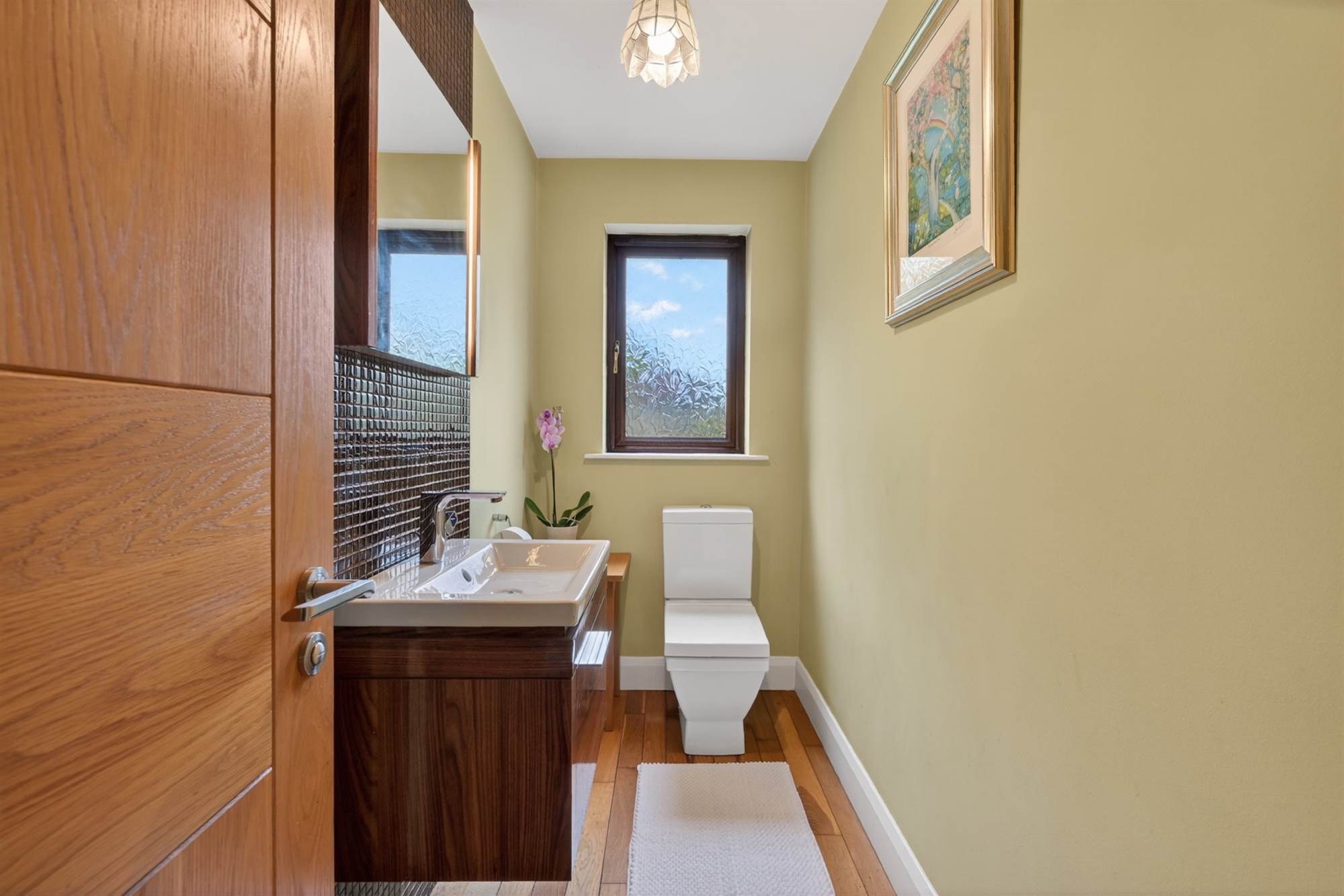 Duravit low flush wc and sink unit with storage below, chrome mixer tap, feature Duravit mirror. Solid oak flooring.
