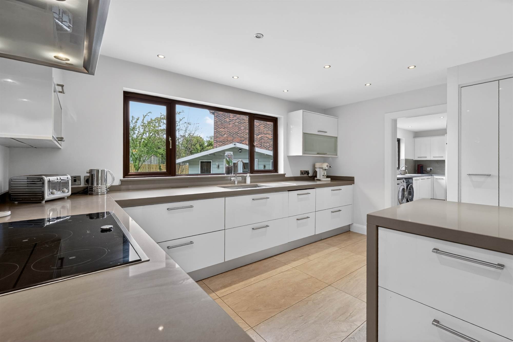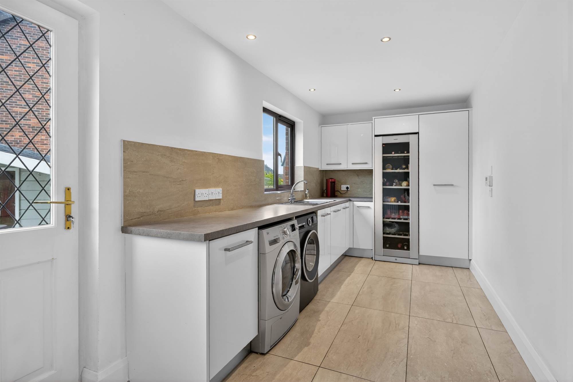 Excellent range of high and low level units, plumbed for washing machine, space for tumble dryer, wine fridge. Access to rear. Access to garage.
