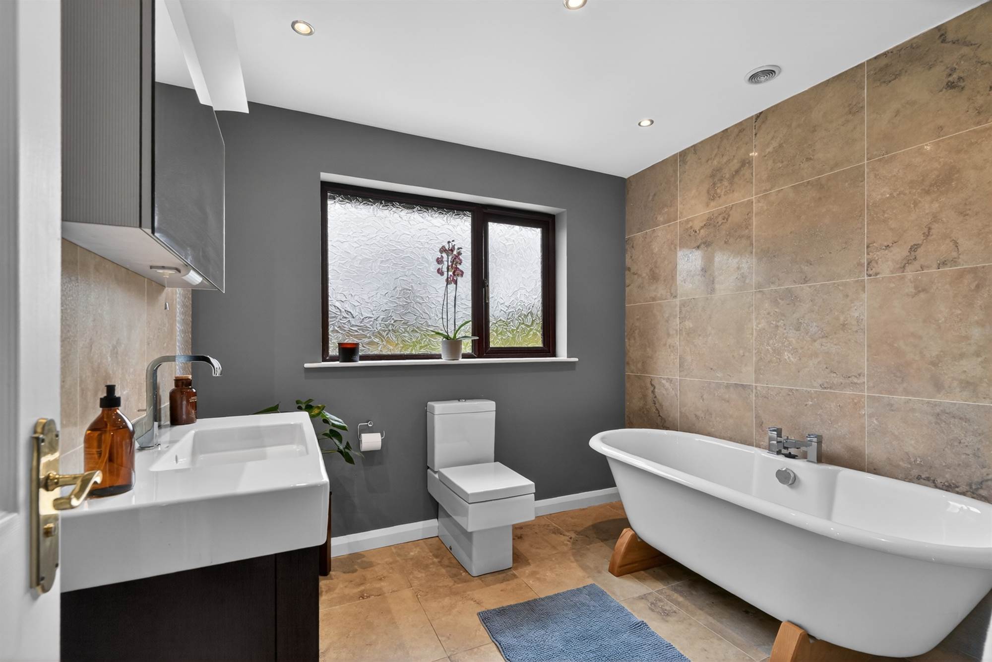 Ceramic tiled floor, Duravit low flush wc, free standing bath with chrome mixer taps, part tiled walls, heated towel rail, large Duravit sink with chrome mixer taps, feature mirror.