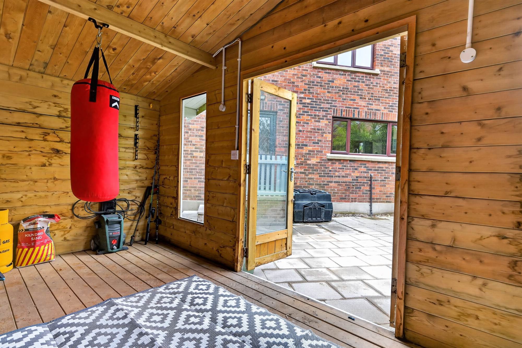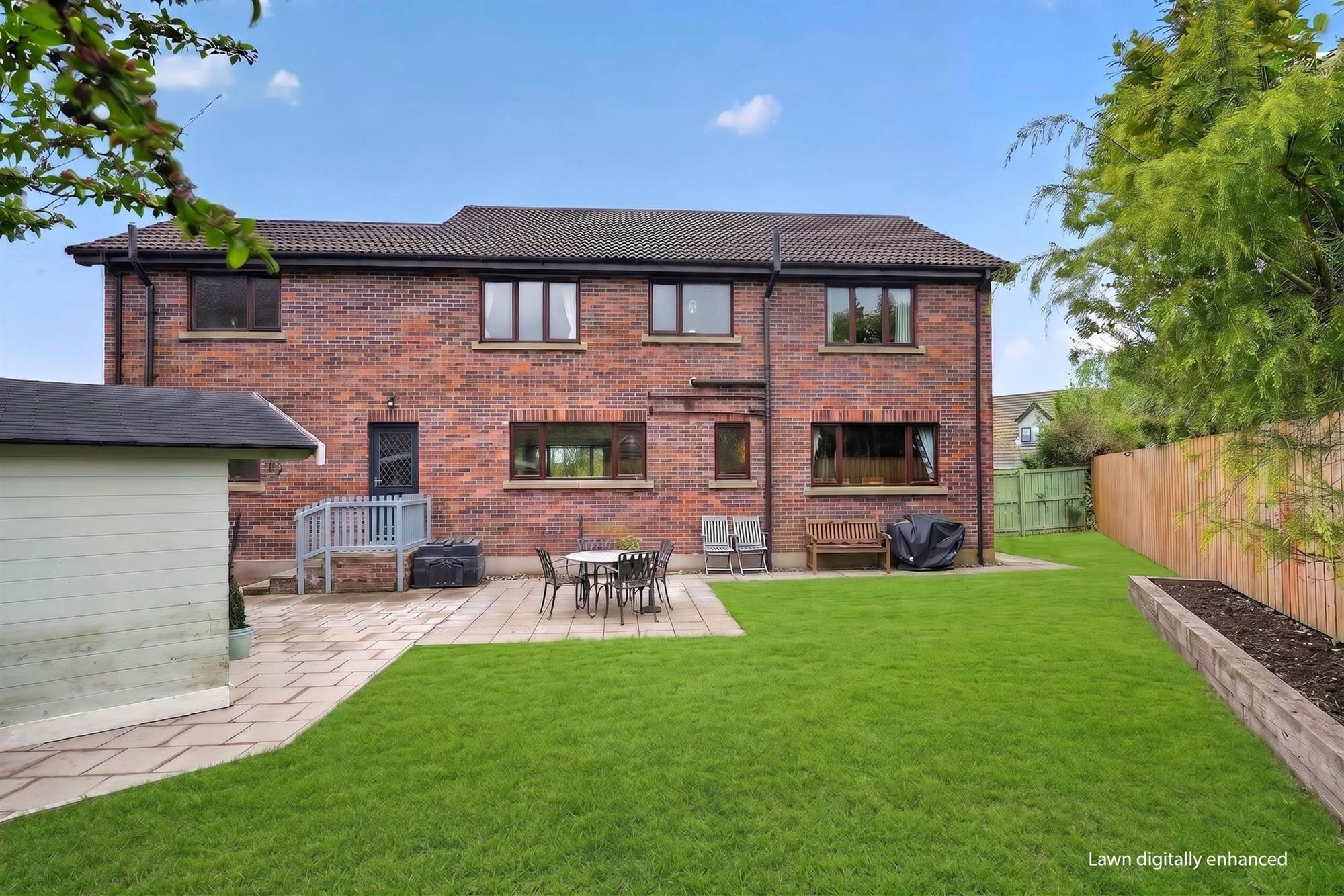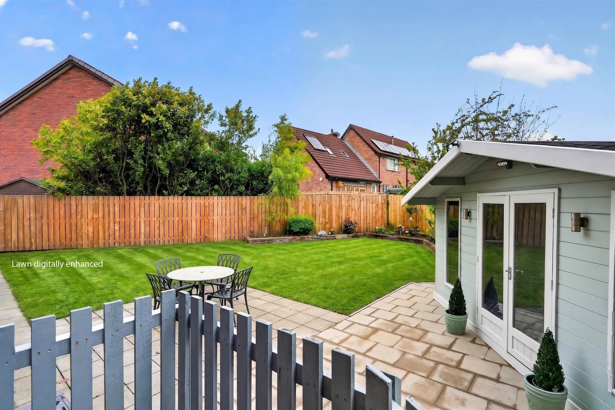 Garden to rear in lawn, garden room ideal for home office, paved patio seating area.