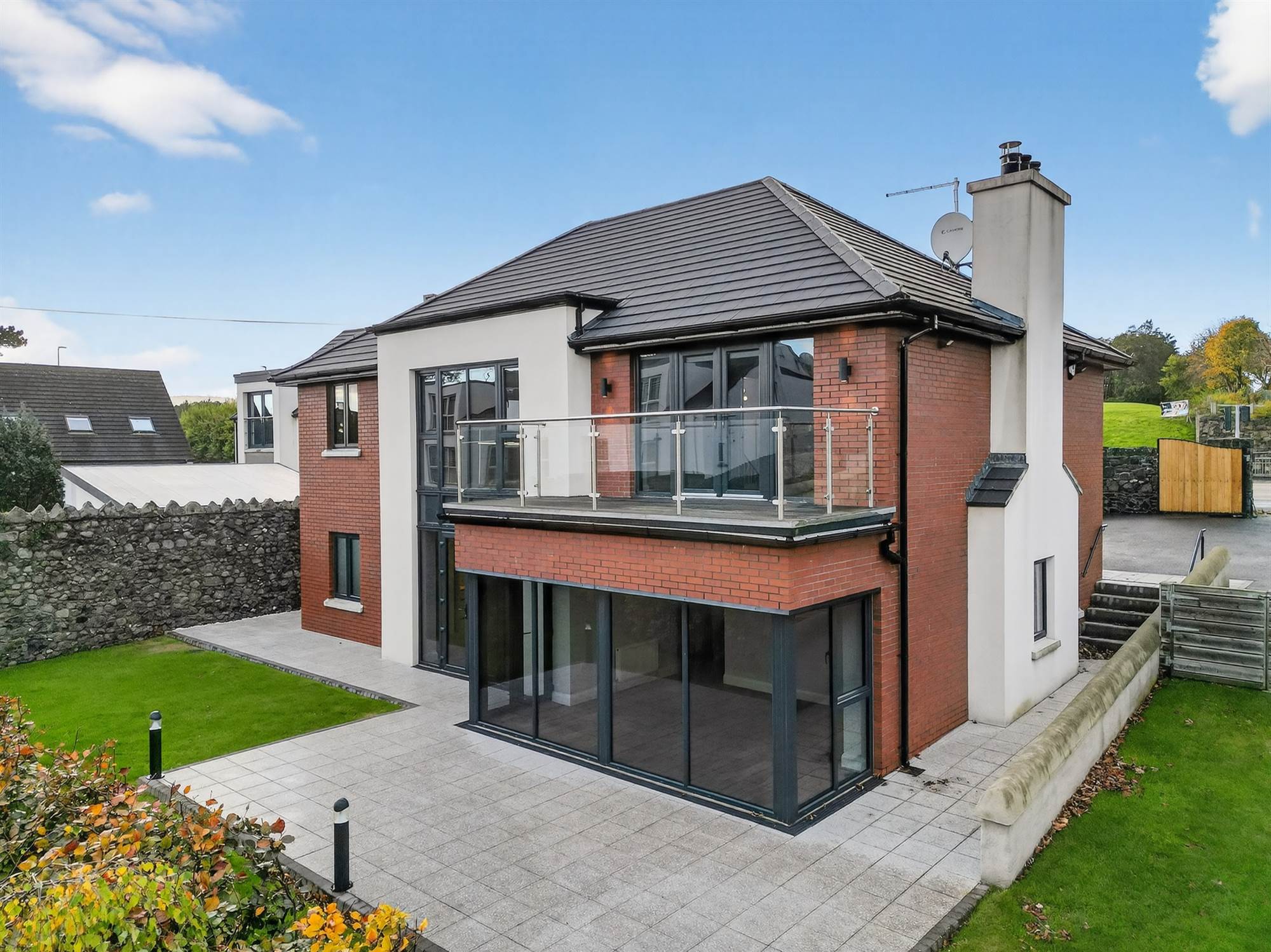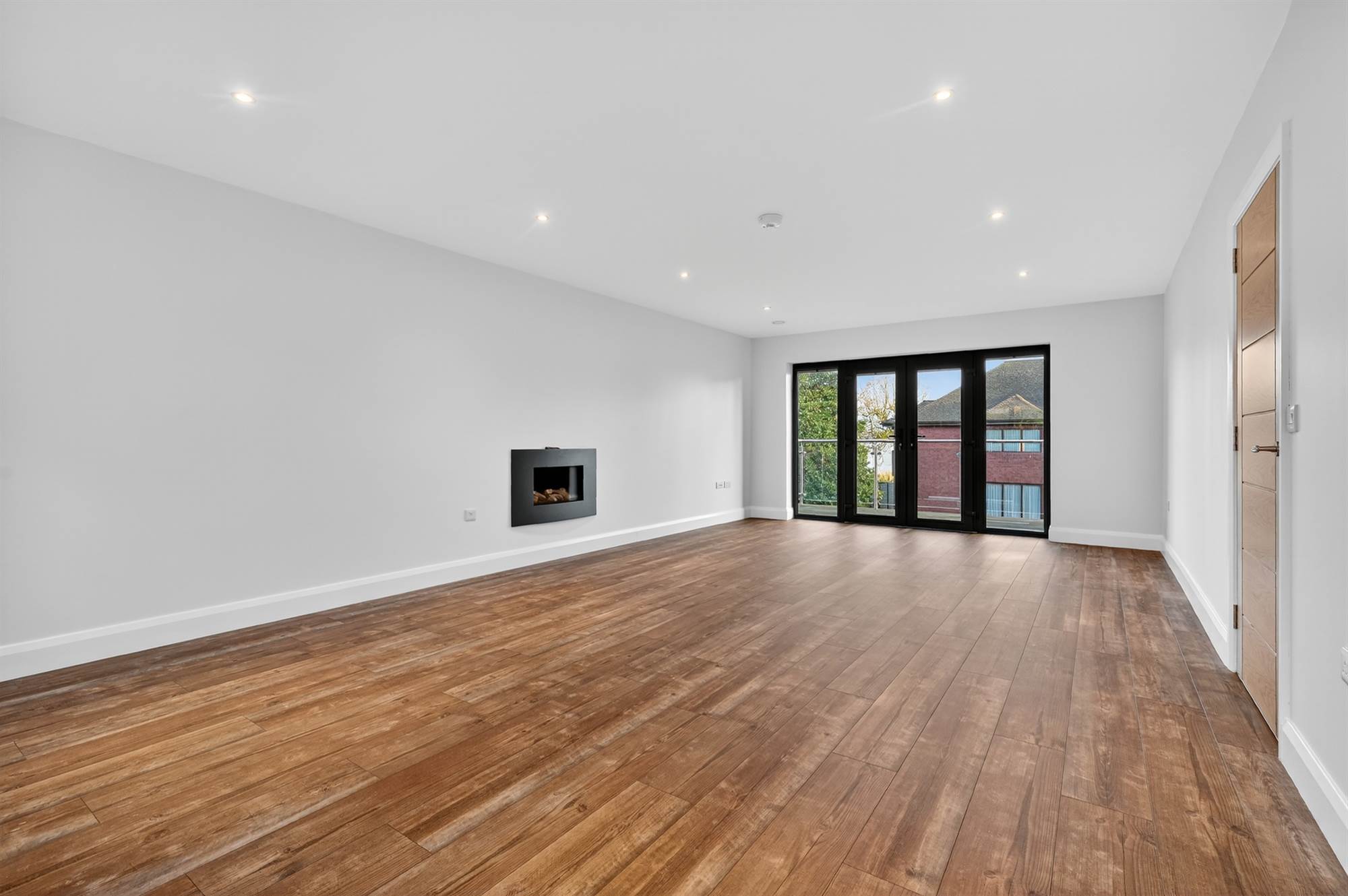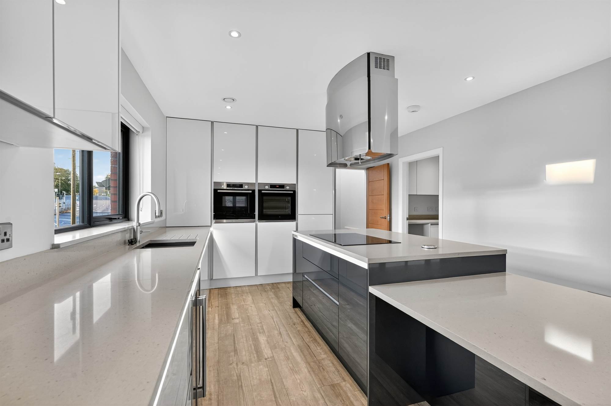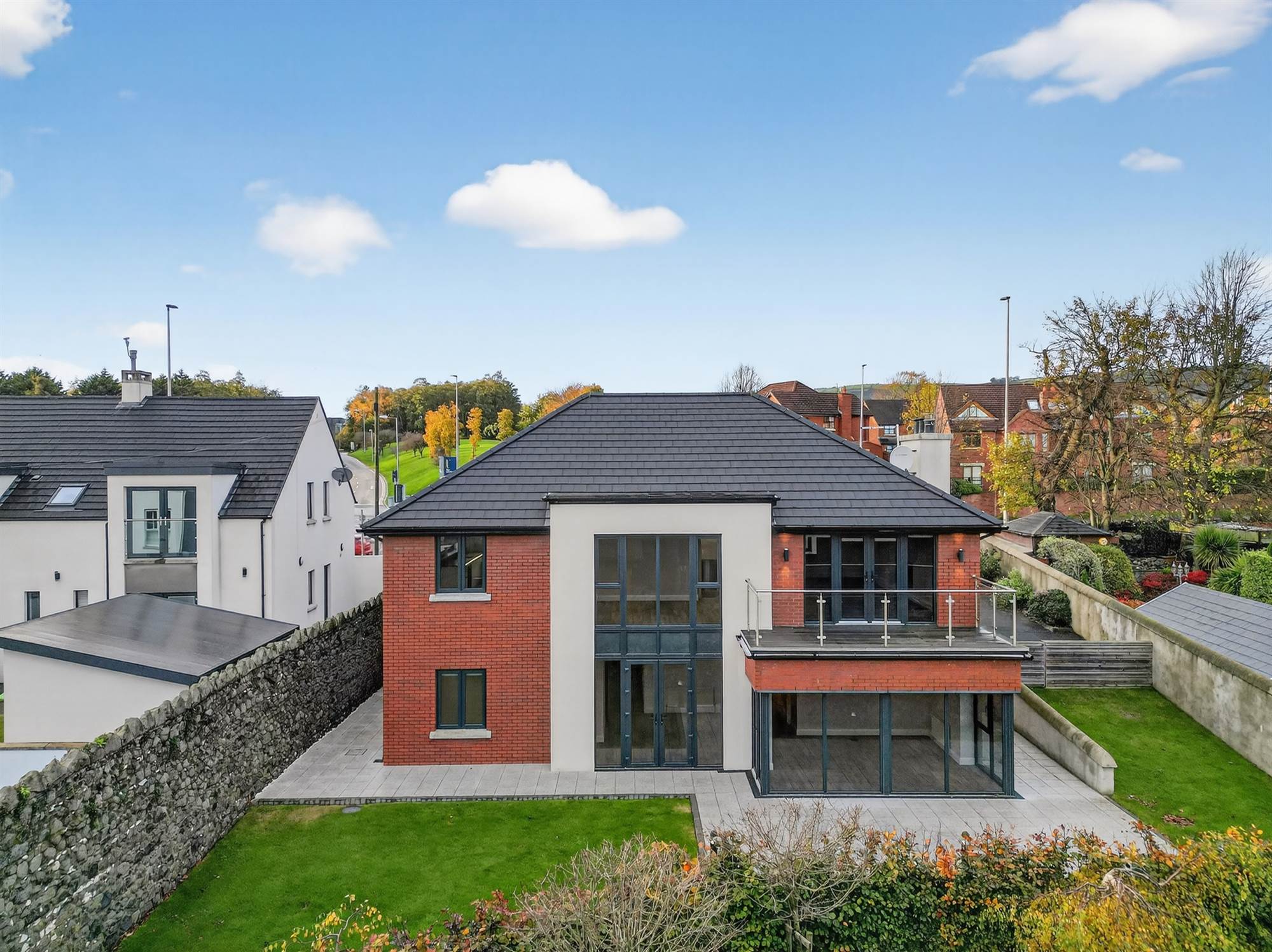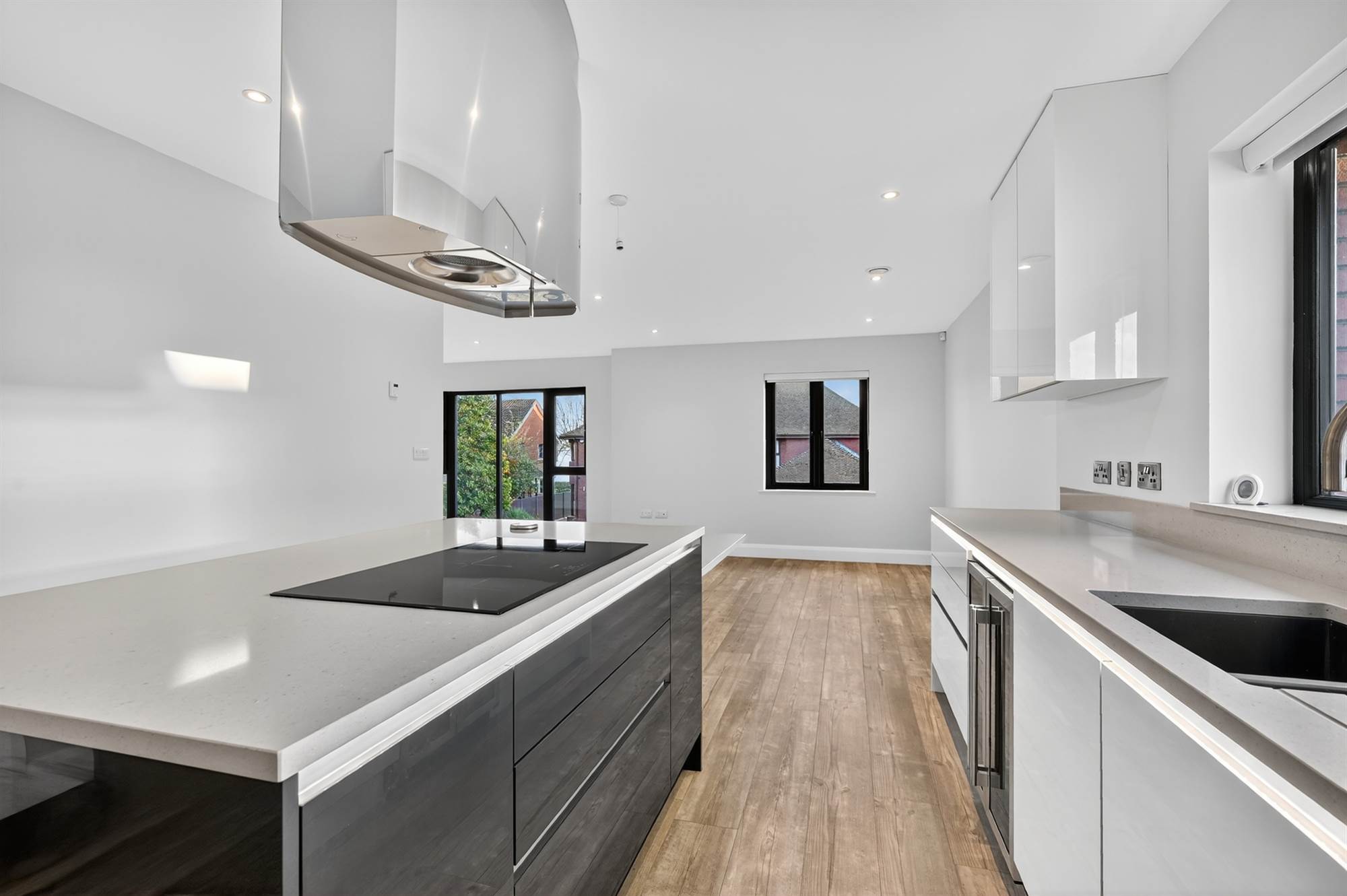 Extending close to 3,500 sqft, the property has been designed with modern living in mind. The first floor features a welcoming living room with feature balcony terrace, a separate family room with dining area perfect for entertaining or relaxing. The heart of the home is the bespoke kitchen, fitted with an extensive range of built-in units, integrated appliances, and a casual dining area that blends practicality with contemporary elegance. There is also the option of a study / fifth bedroom above the garage.