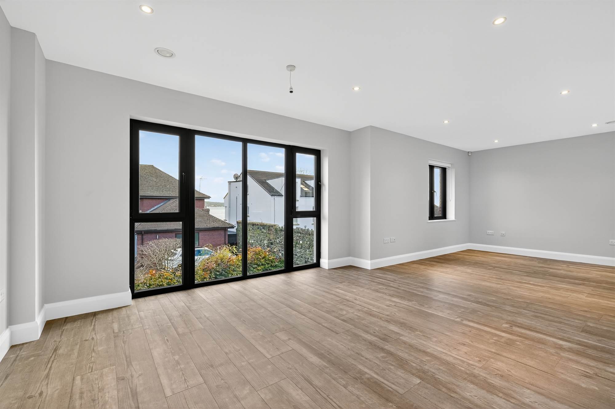 Quickstep vinyl plank flooring, dual aspect windows, uPVC double glazed French door to large balcony with composite decking and views to Belfast Lough.