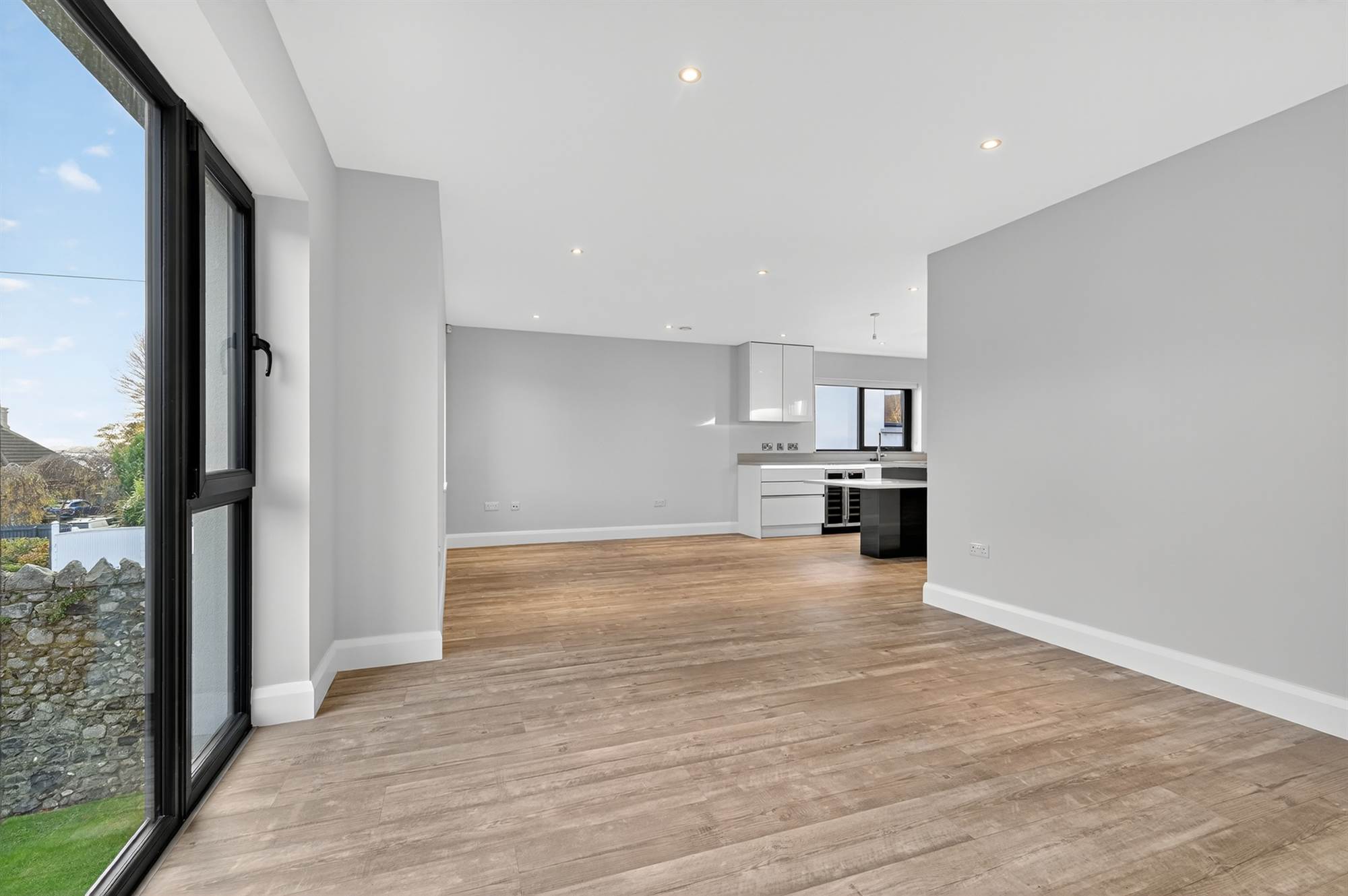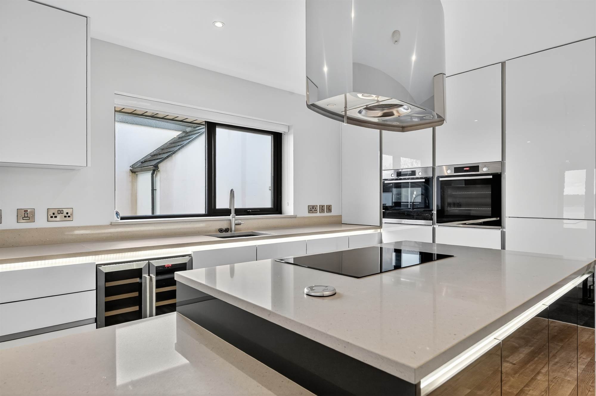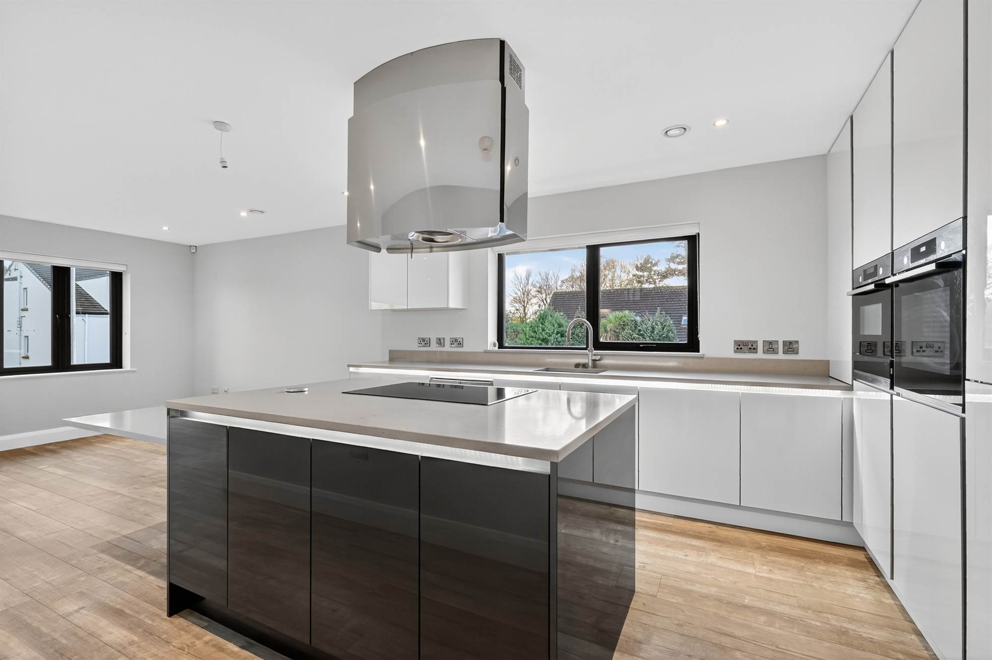 Contemporary, modern, fully fitted kitchen with excellent range of high and low level units, built-in high level Bosch oven, combi microwave with warming plate below, integrated fridge and freezer, single drainer 1.5 bowl sink unit with Quooker mixer tap, views to Belfast Lough, built-in double wine cooler, breakfast island with granite worktop, five ring Bosch ceramic induction hob with extractor fan above, pull-up electric socket, built-in granite breakfast bar open to ample dining and living space with dual aspect windows, Quickstep vinyl plank flooring.
