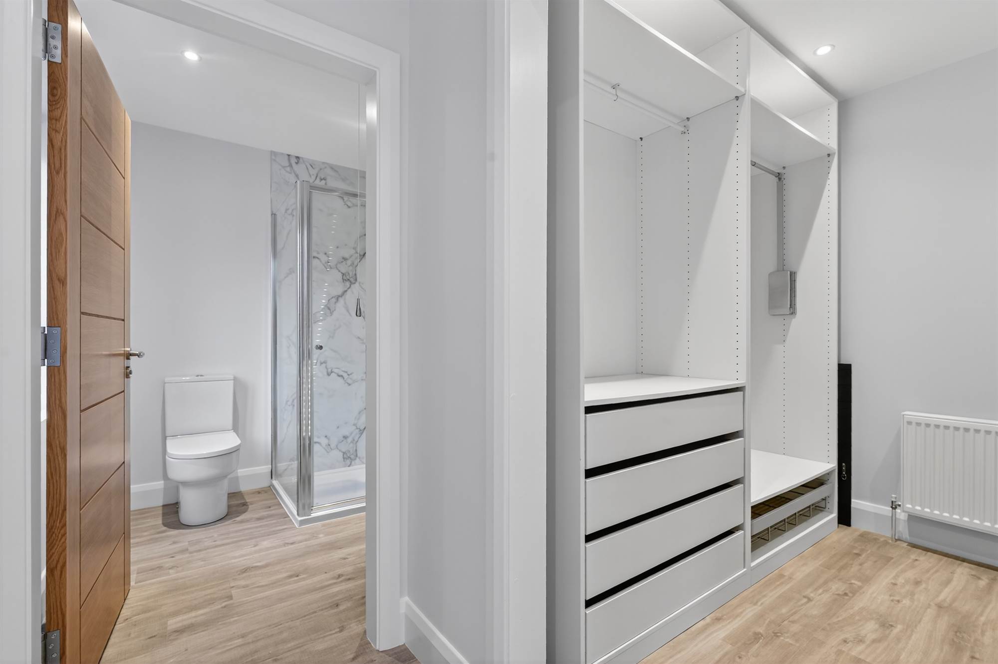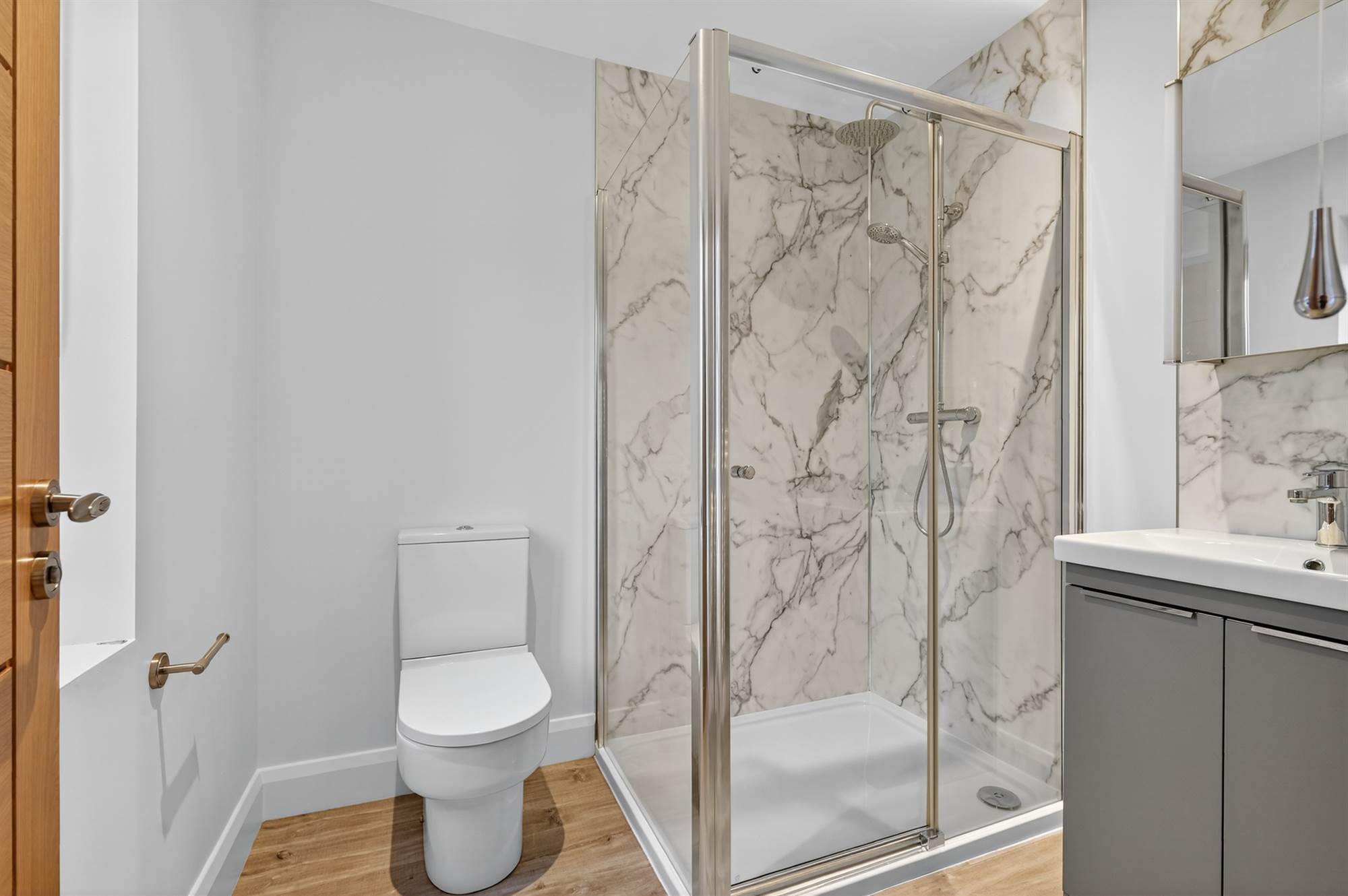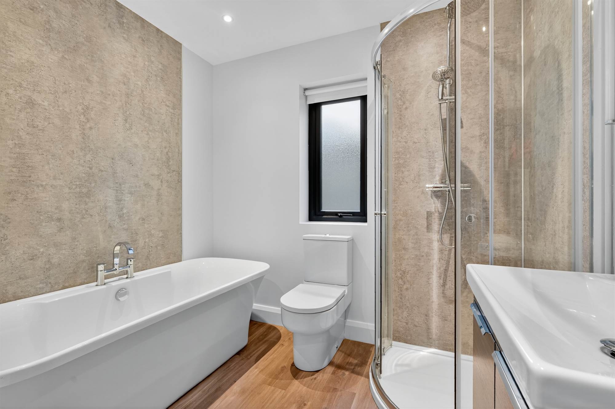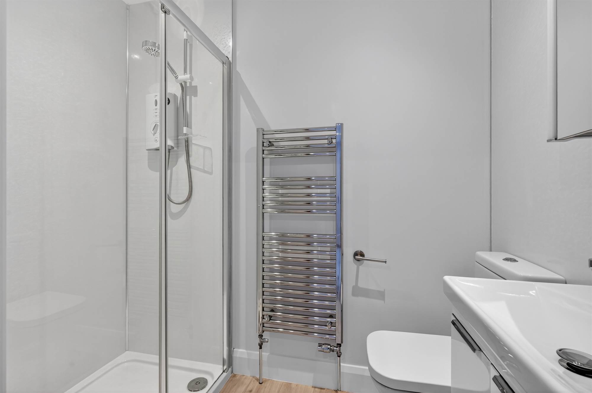 White suite comprising low flush wc, built-in shower cubicle with chrome overhead shower unit, vanity unit with chrome mixer tap, tiled splashback, chrome heated towel rail, Quickstep vinyl plank flooring, low voltage spotlights.