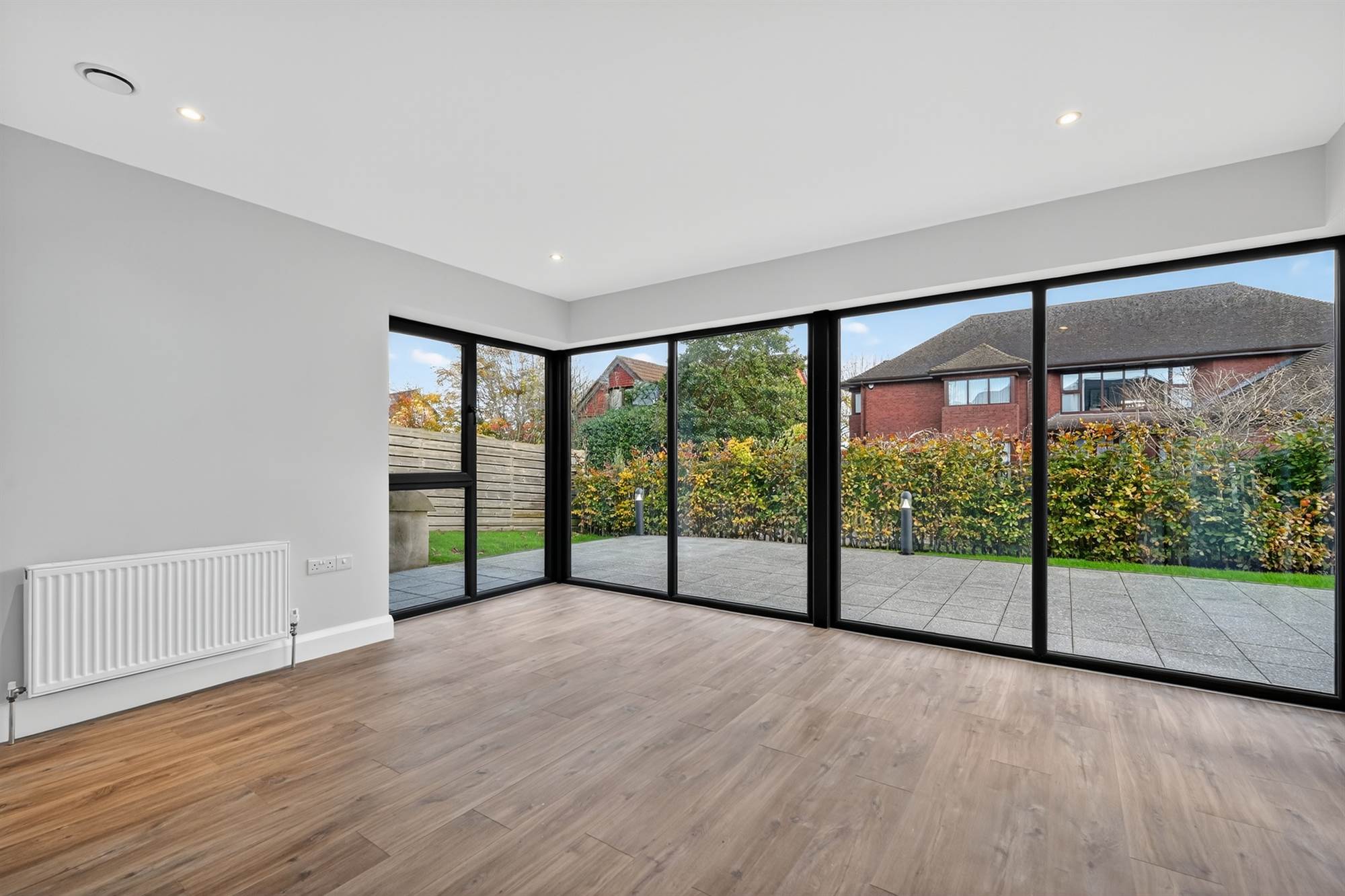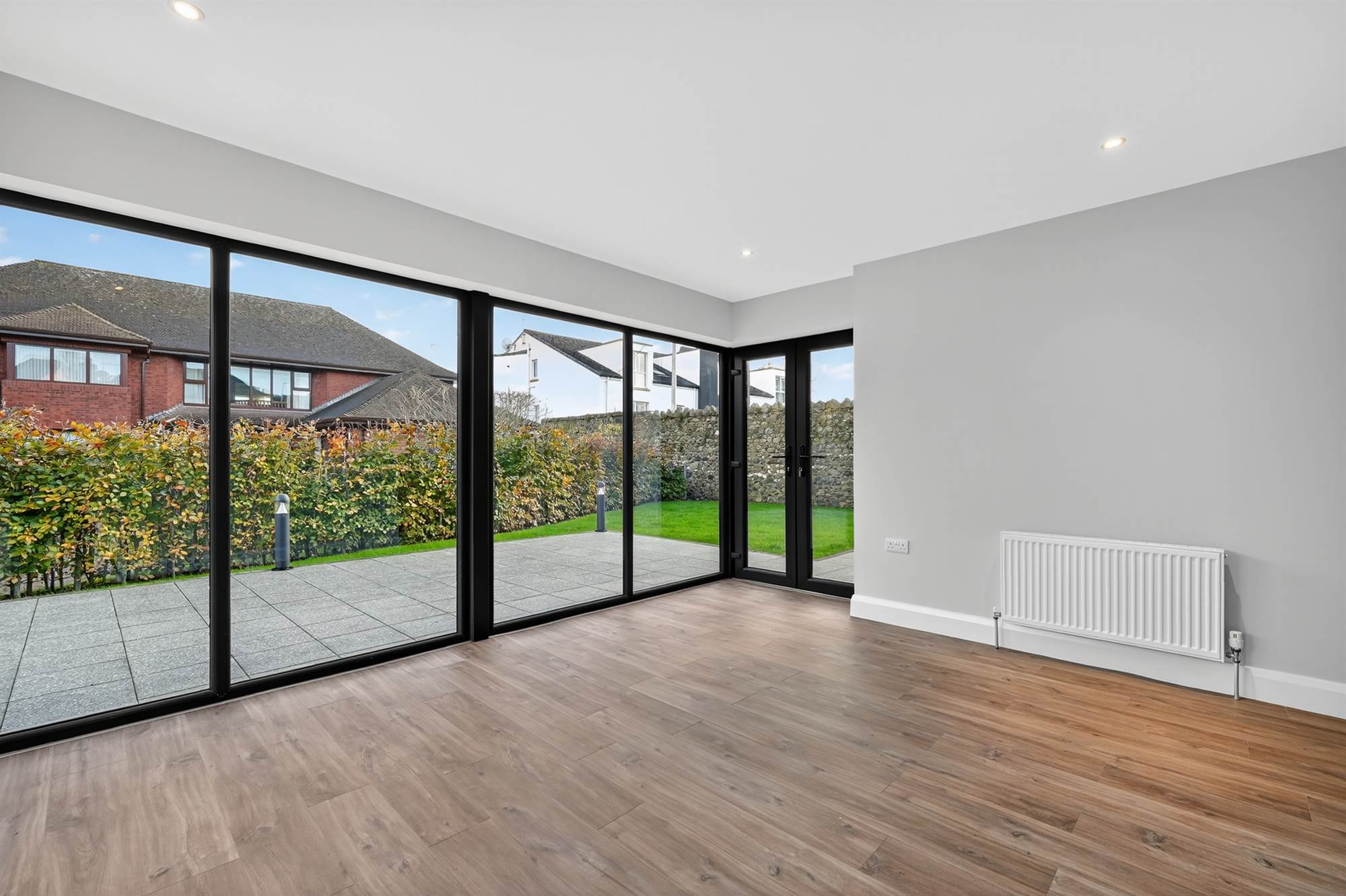 Feature triple aspect windows, uPVC double glazed French doors to rear garden.