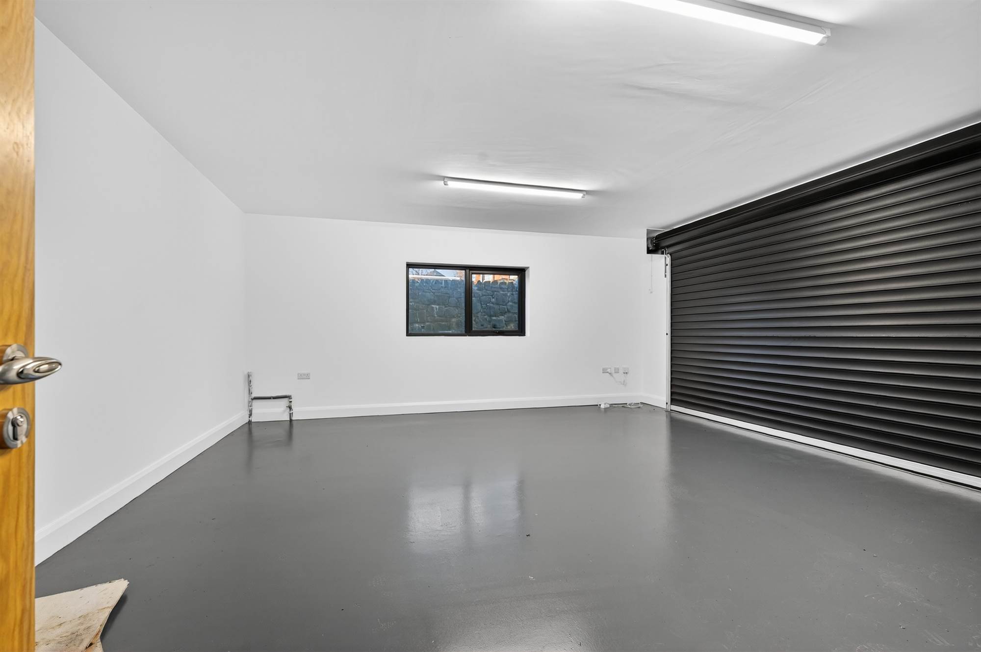 Electric up and over door, concrete floor, built-in Worcester gas fired boiler.