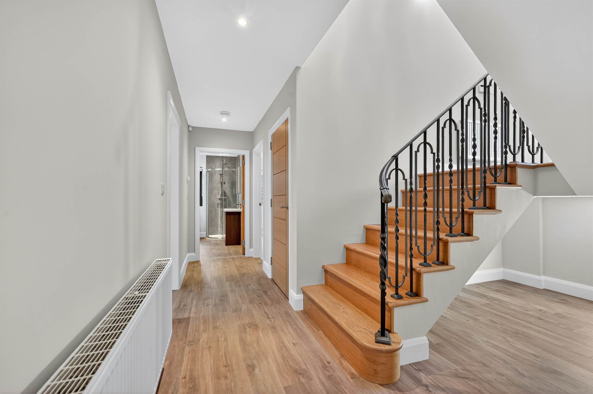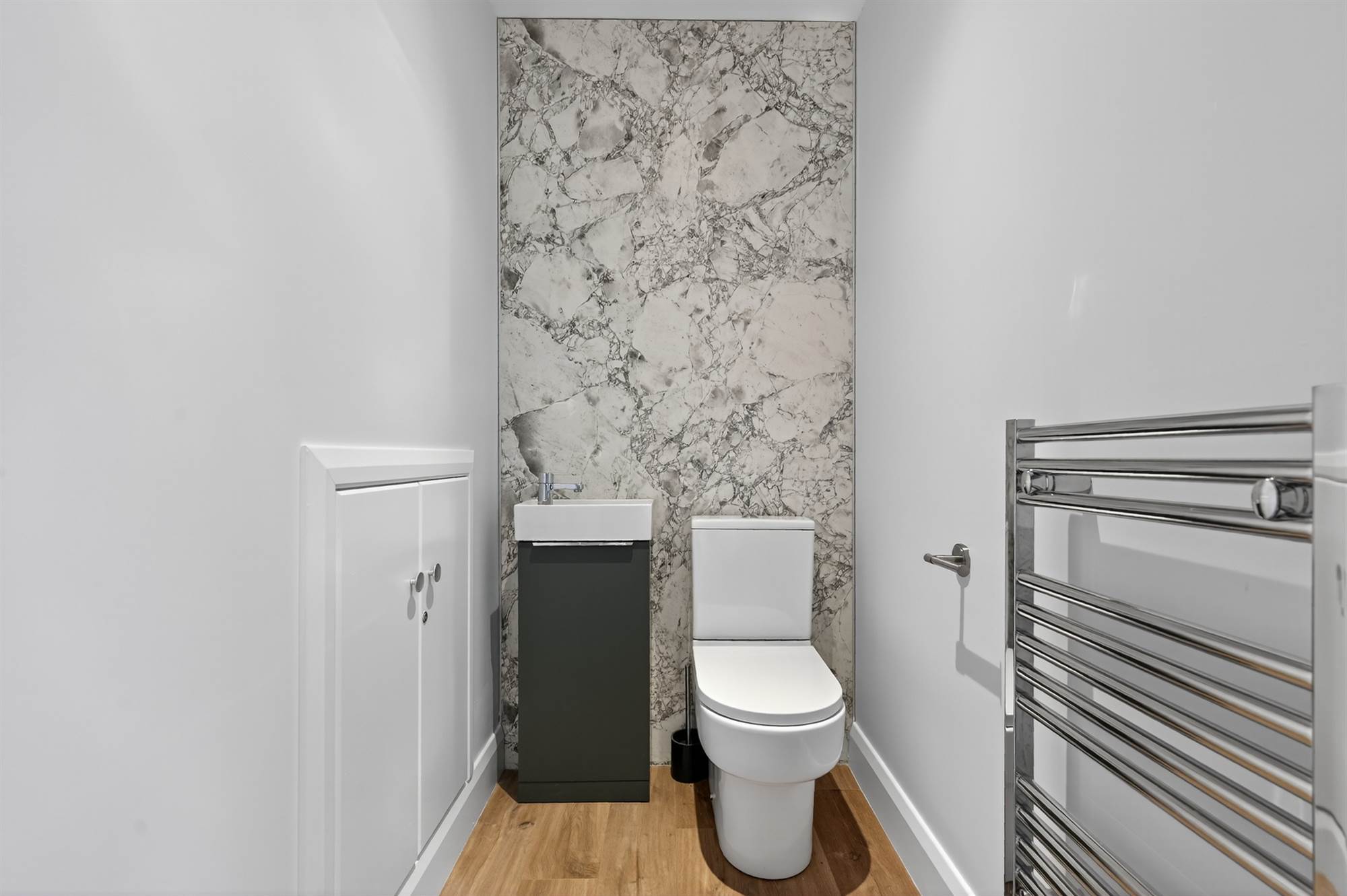 White suite comprising low flush wc, vanity unit with chrome mixer tap, chrome heated towel rail , Quickstep vinyl plank flooring, Stairs to . . . .