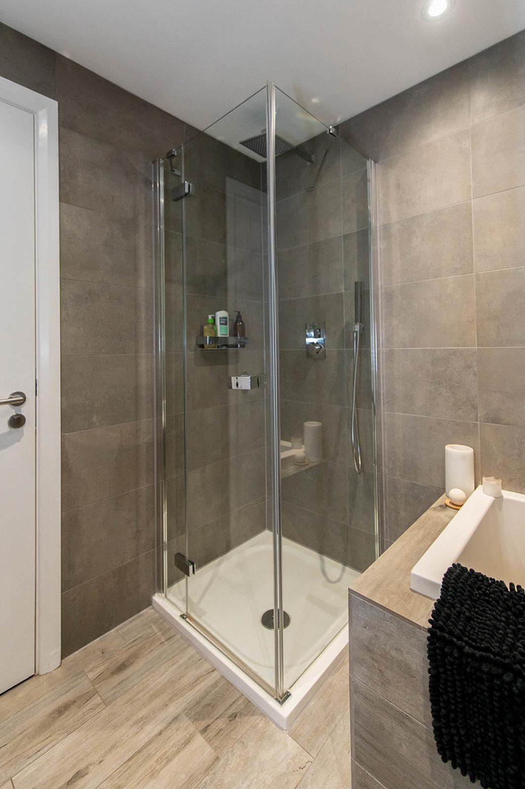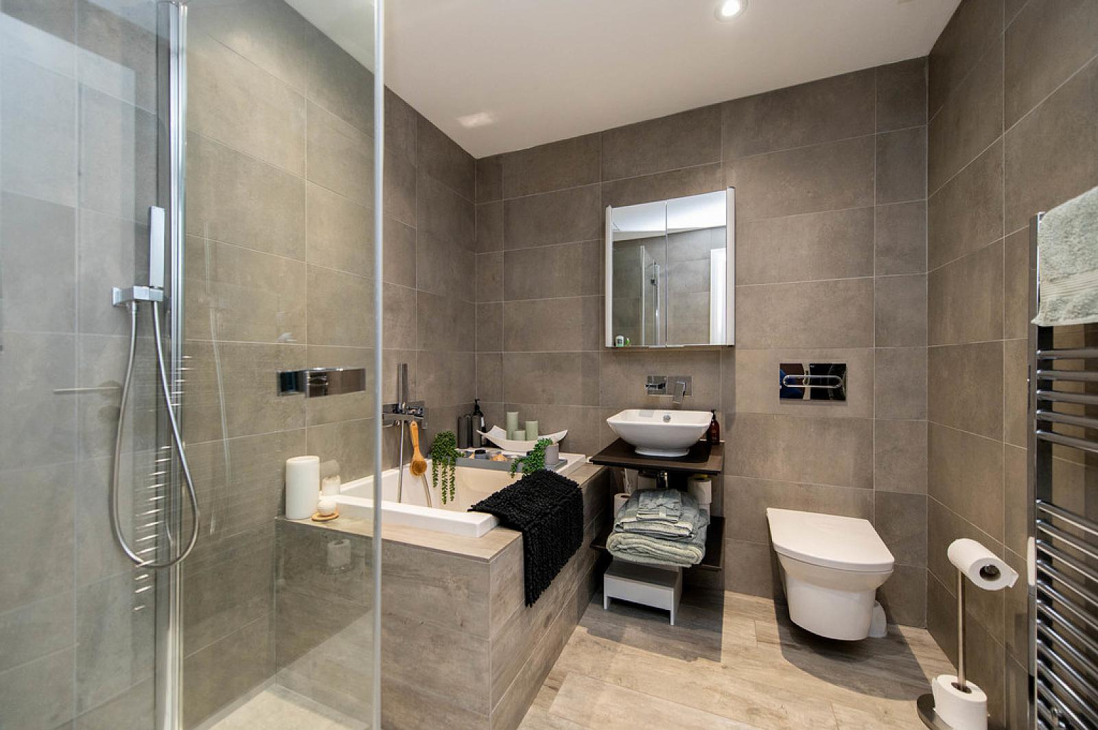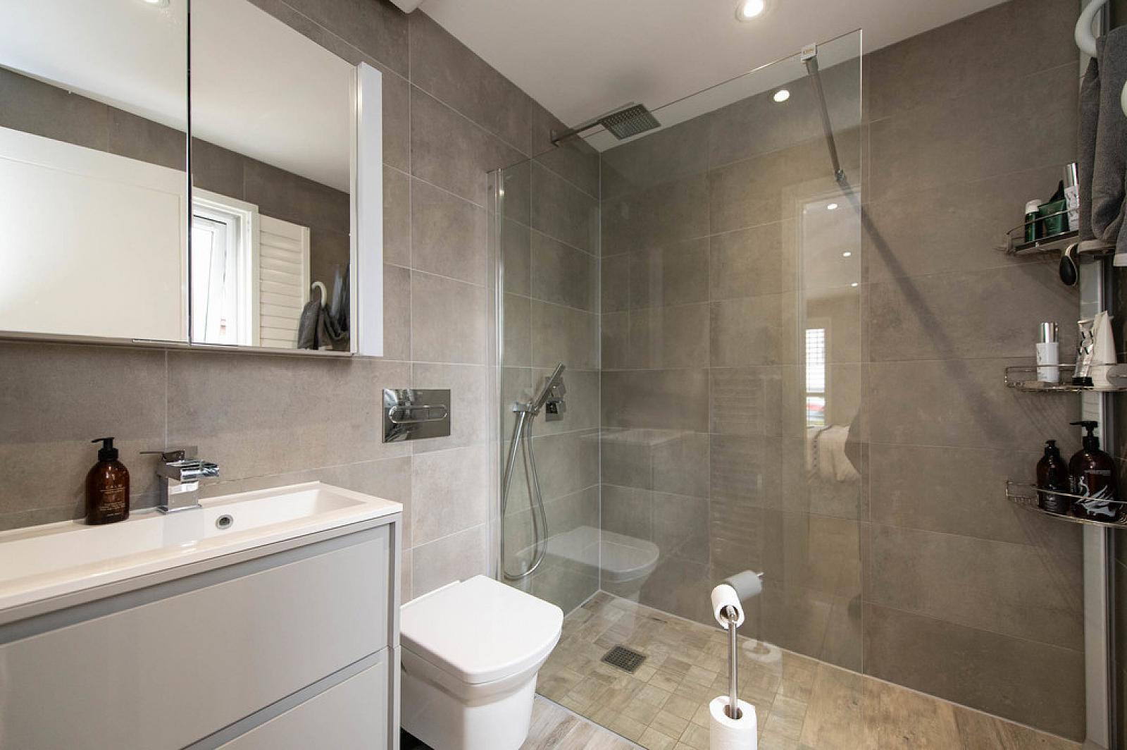ENSUITE SHOWER ROOM Glazed shower screen, controlled shower, overhead rain shower, wall tiling, vanity unit, modern radiator/ towel rail, extractor fan