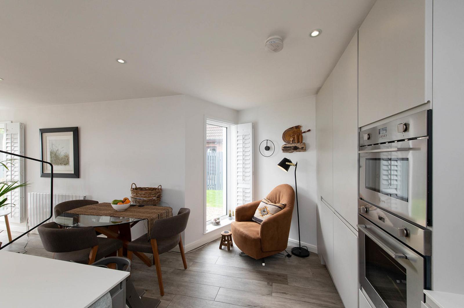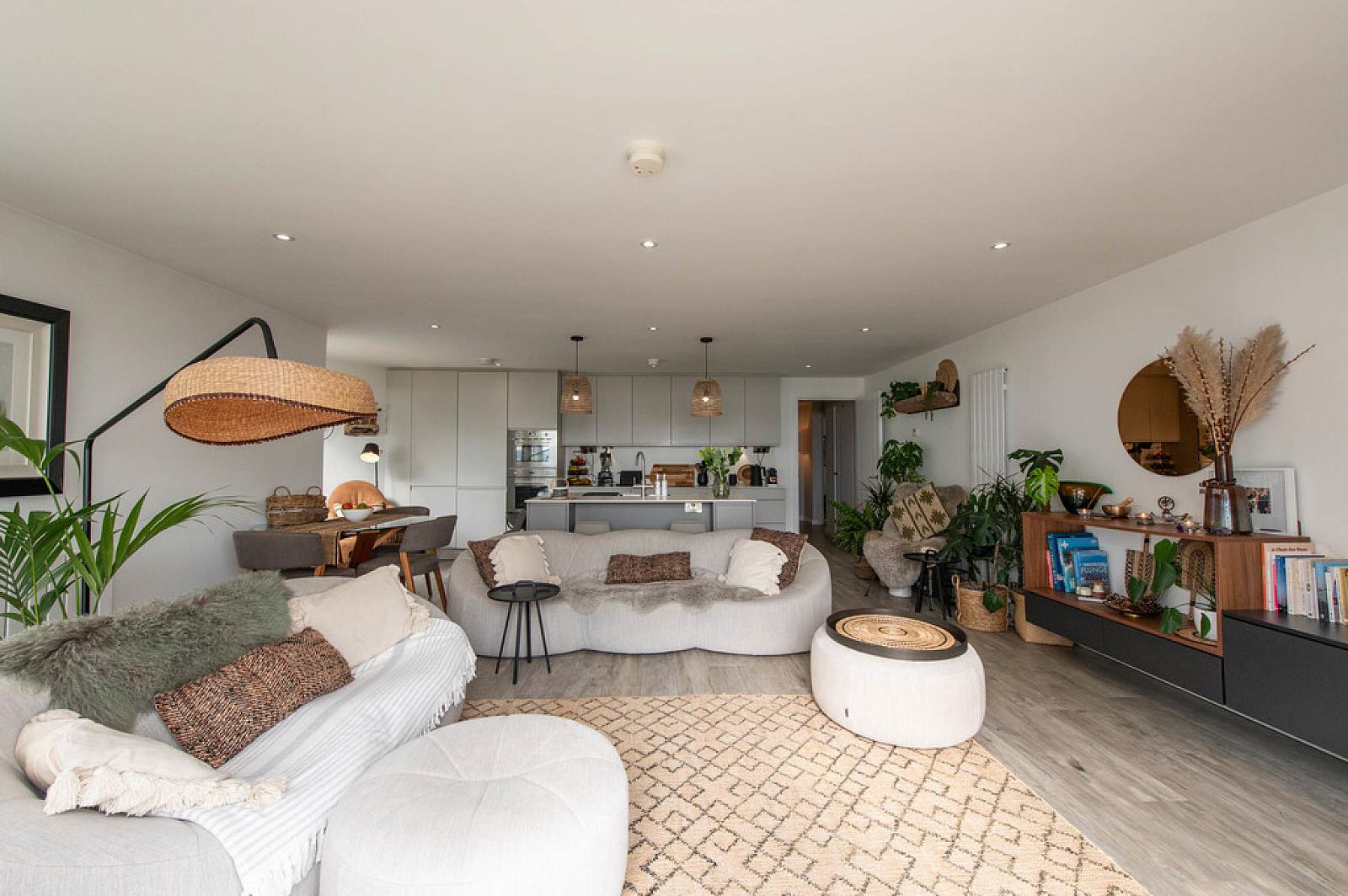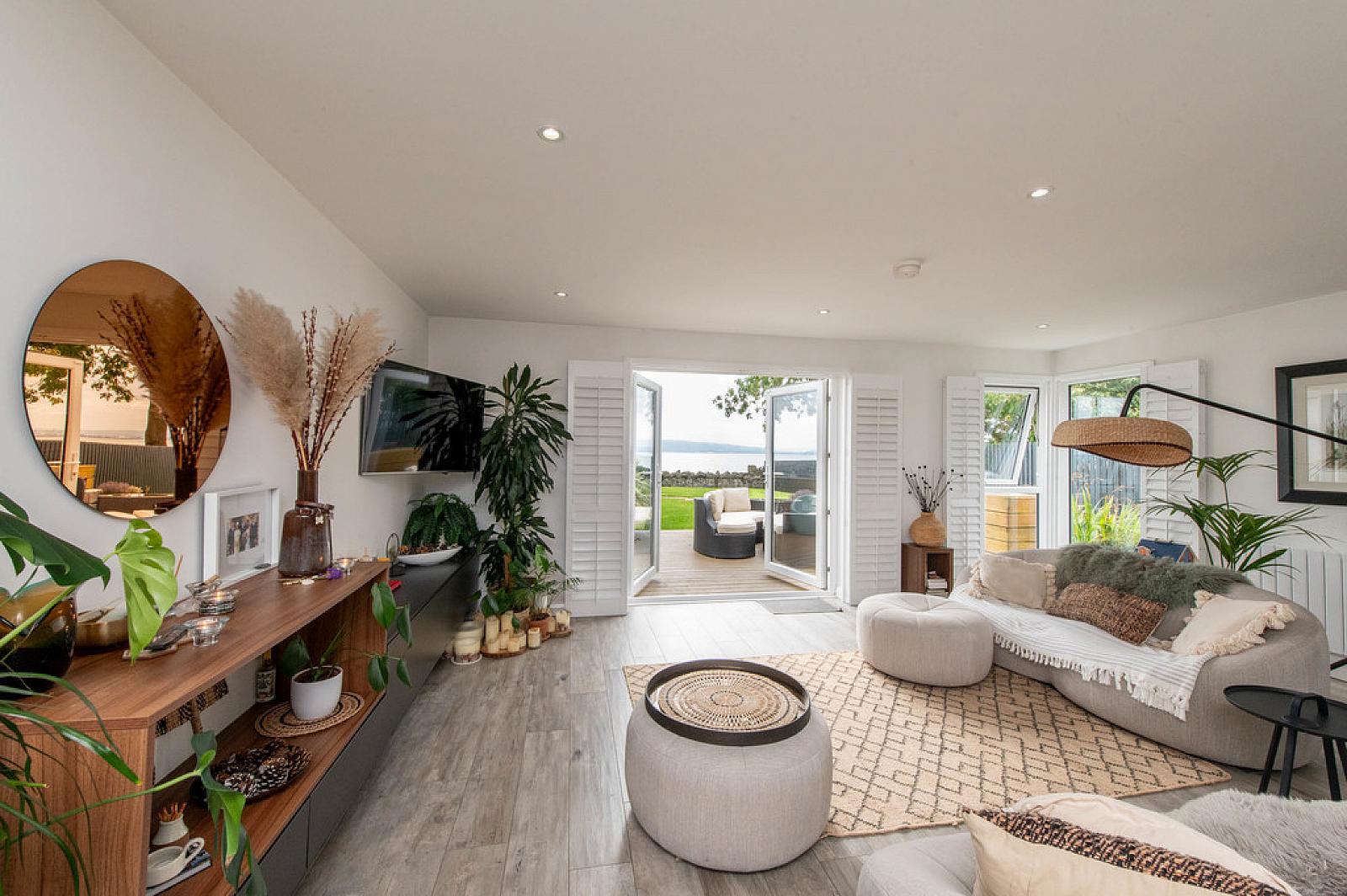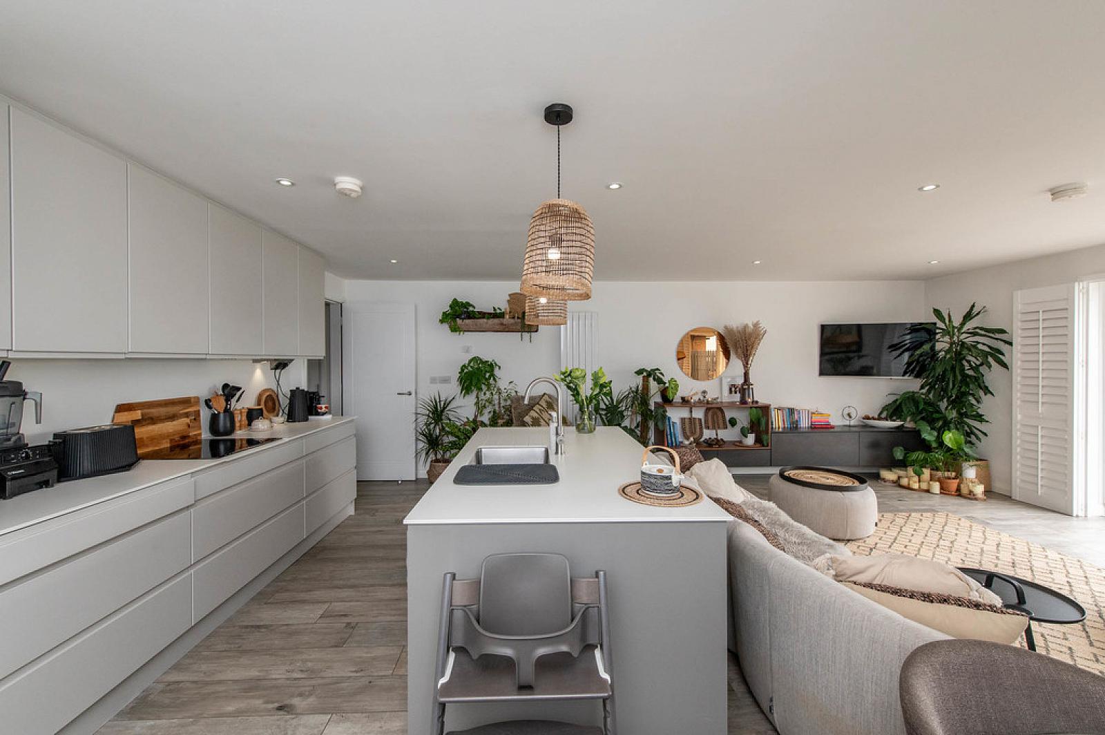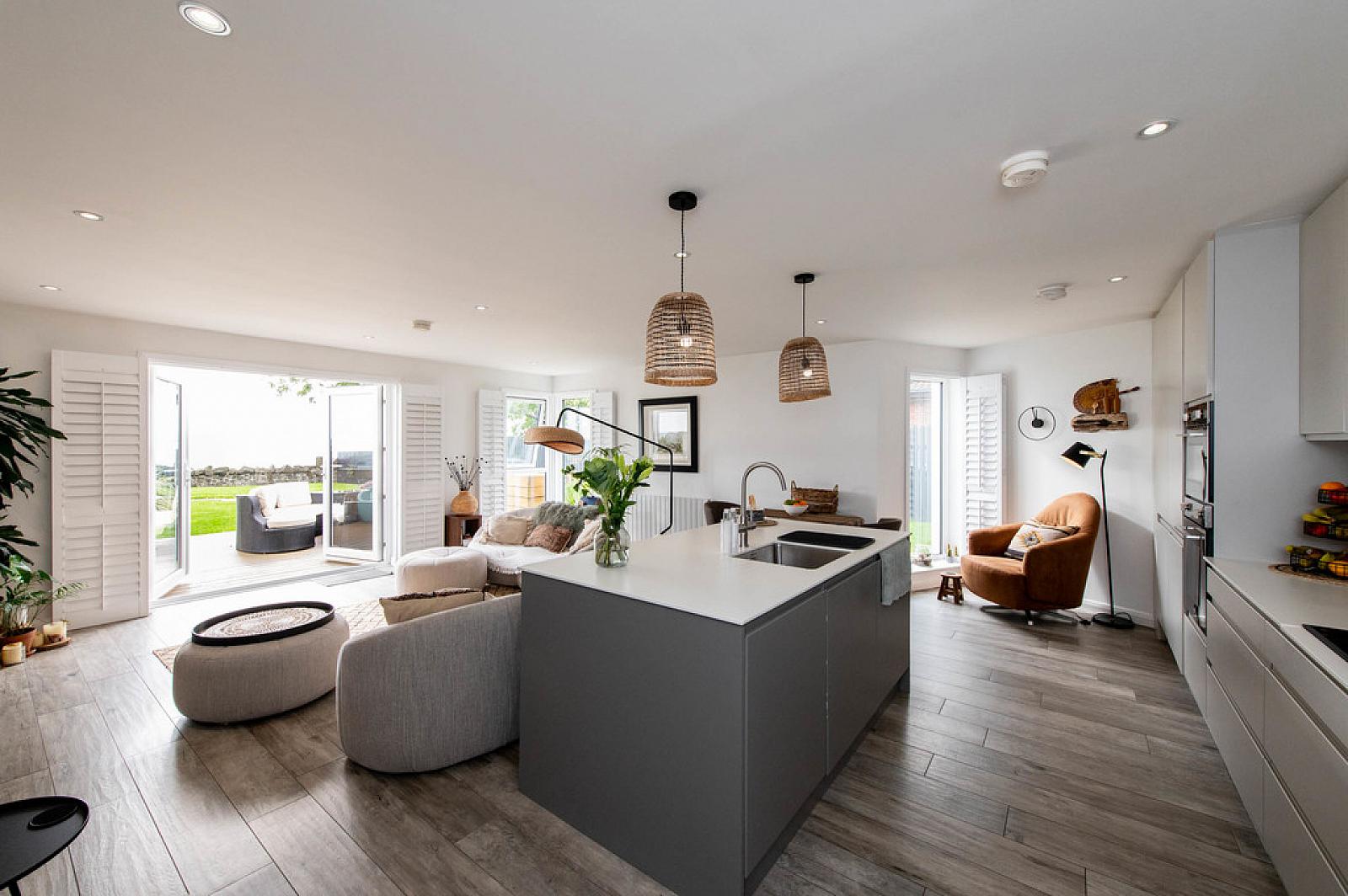 OPEN PLAN LOUNGE/ KITCHEN/ DINING 22' 10" x 18' 1" (6.96m x 5.51m) Range of high and low level units, luxury worksurfaces, inlaid hob unit, dishwasher, double oven and microwave, extractor fan, breakfast bar, ceramic tiled flooring, downlighters, French doors to decking